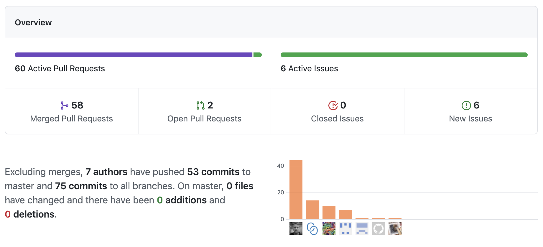 현재 프로젝트에서 열려있는 PR은 6건이고, 종료된 PR은 375건입니다. PR 역시나 프로젝트 진행 기간이나 커밋수 대비 적은 편에 속합니다.