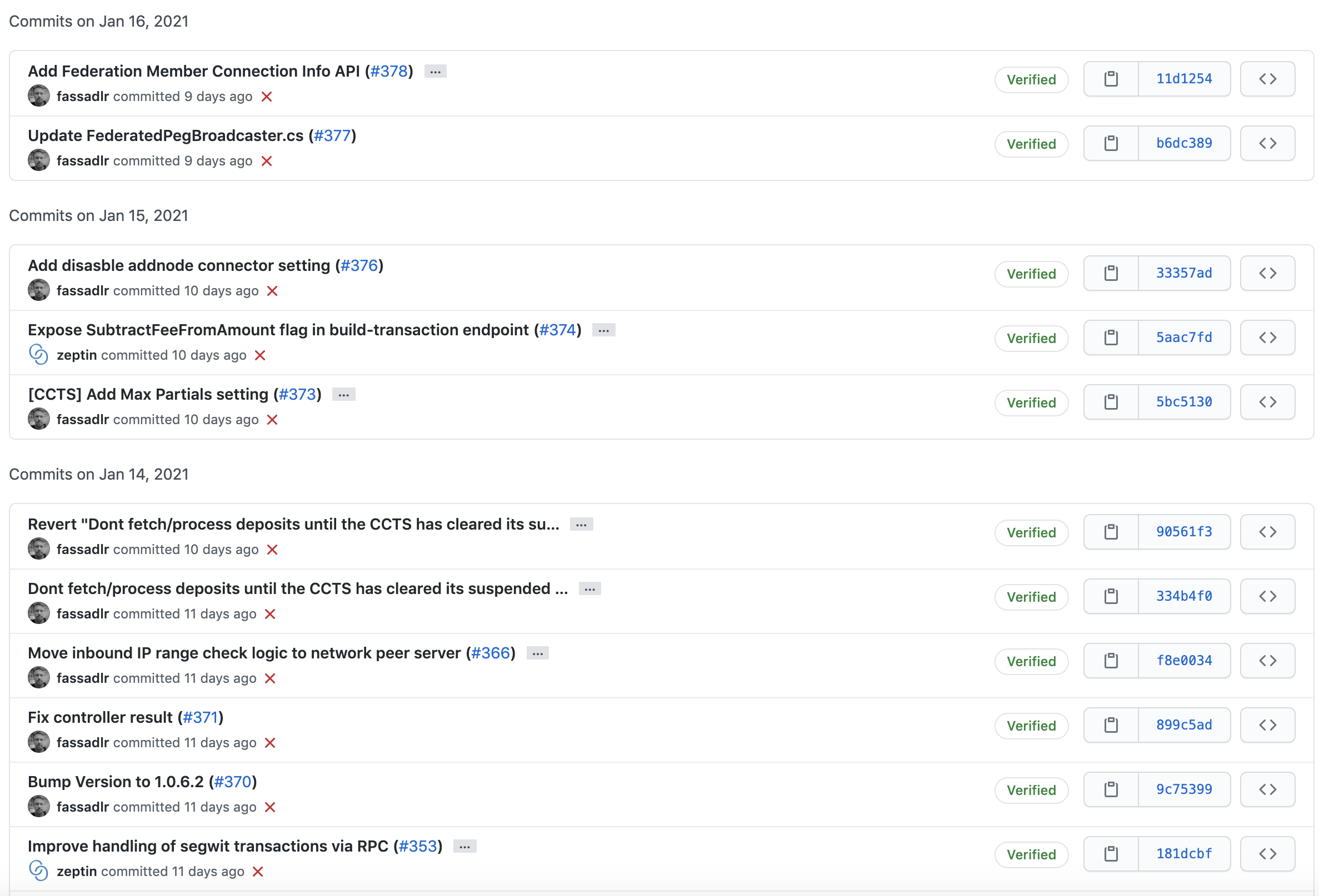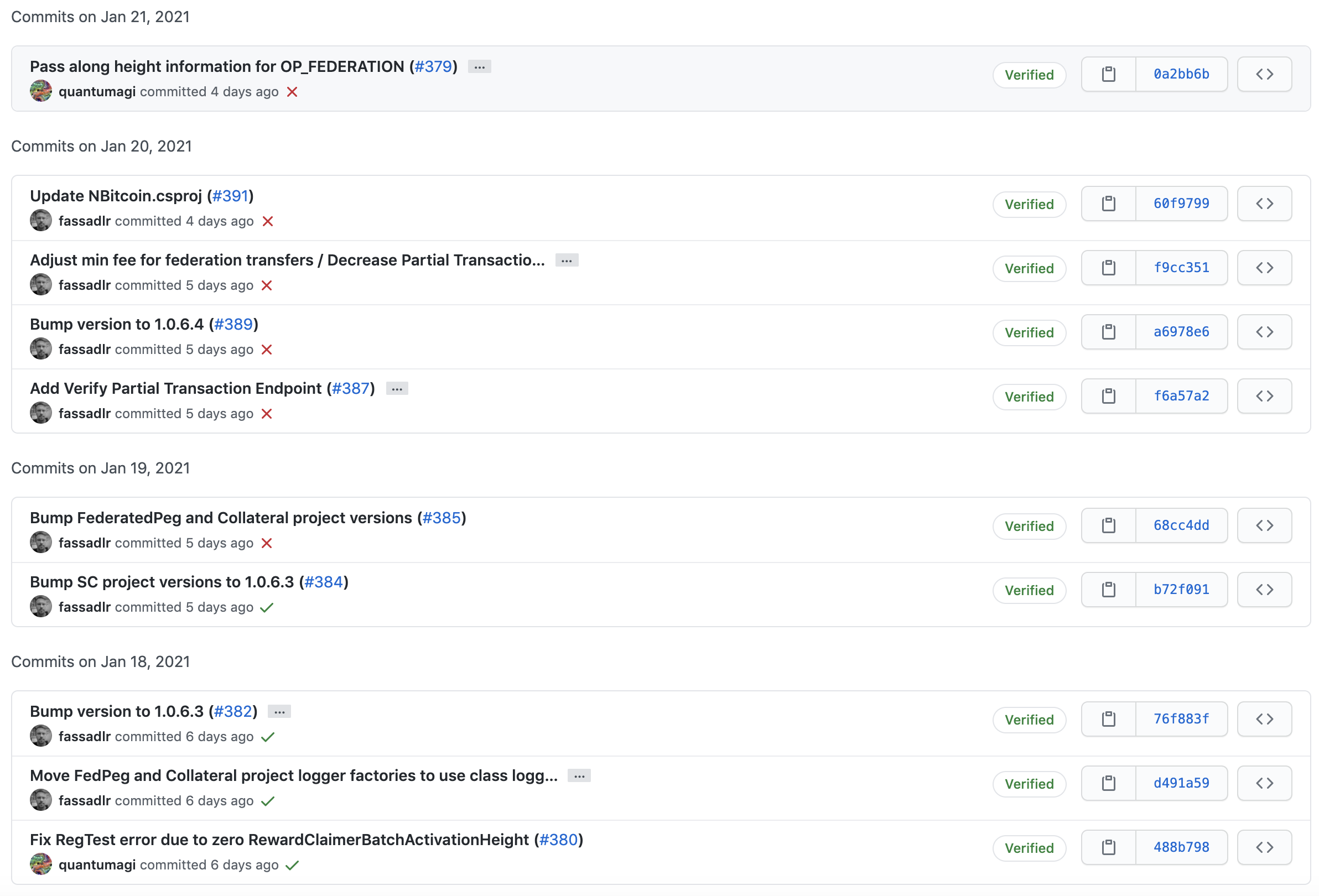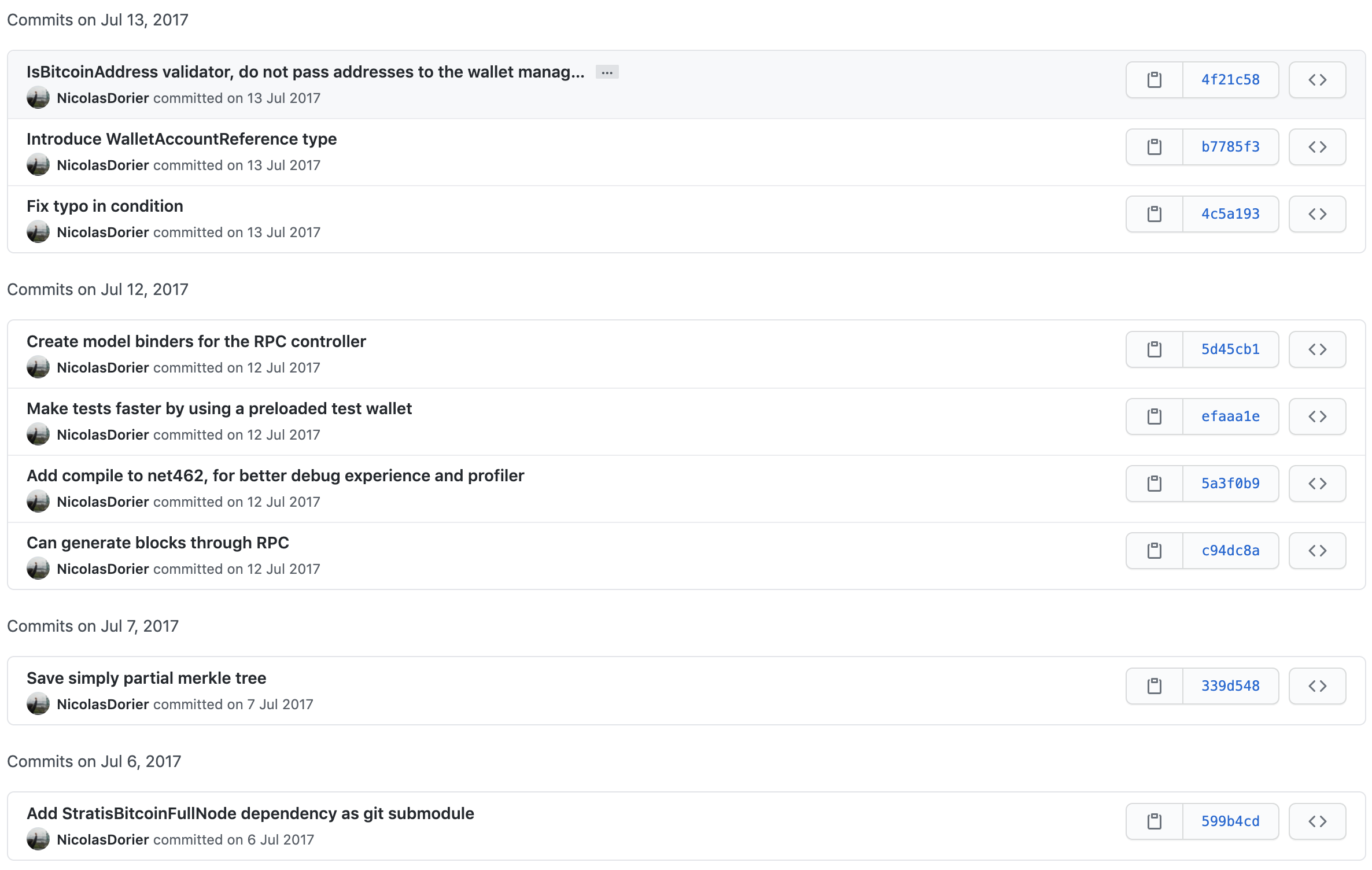 StratisFullNode 저장소와 같은 경우 다른 프로젝트를 포크해서 생성된 프로젝트가 아니고 실제 바닥부터 개발된 프로젝트는 확실합니다. 4년 전에 initial commit으로 프로젝트를 시작한 것을 확인할 수 있습니다. 초기 개발은 니콜라스 도리에(Nicolas Dorier, 세계 비트코인 전문가 14인 중 한 명)가 개발을 진행했고, 2017년 7월 13일 이후로 스트라티스 프로젝트에 실제 개발엔 참여하지 않는 것으로 확인됩니다. 중요한 사실은 기술력이 좋다는 것이 세계 비트코인 전문가라는 니콜라스 도리에라는 개발자가 참여했고, 스트라티스의 프로젝트를 직접 개발했다는 것에서 나왔던 것 같은데, 과연 기술력이 좋다는 것이 현재까지 유효한지는 한번 살펴봐야 될 것 같습니다.