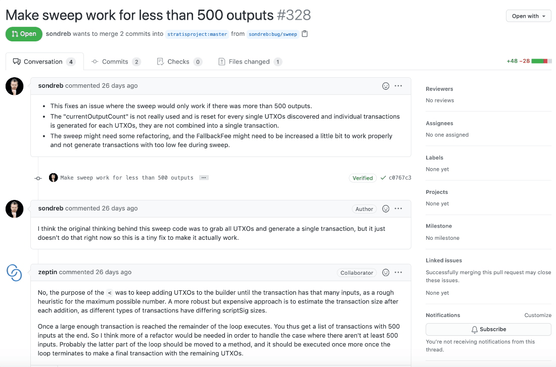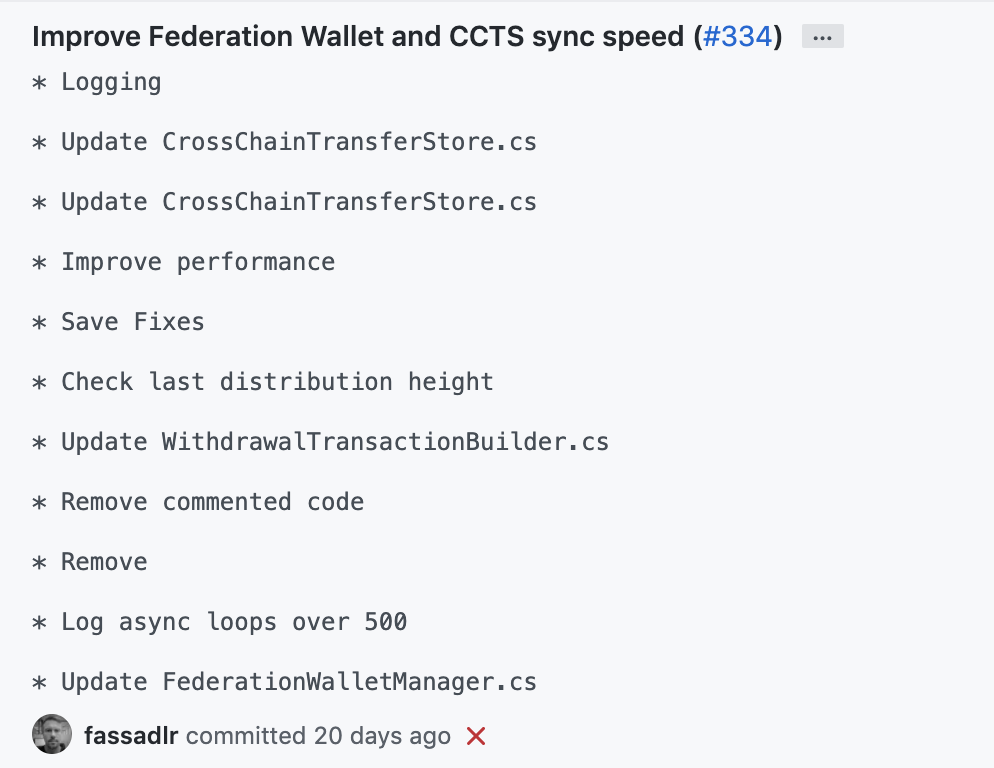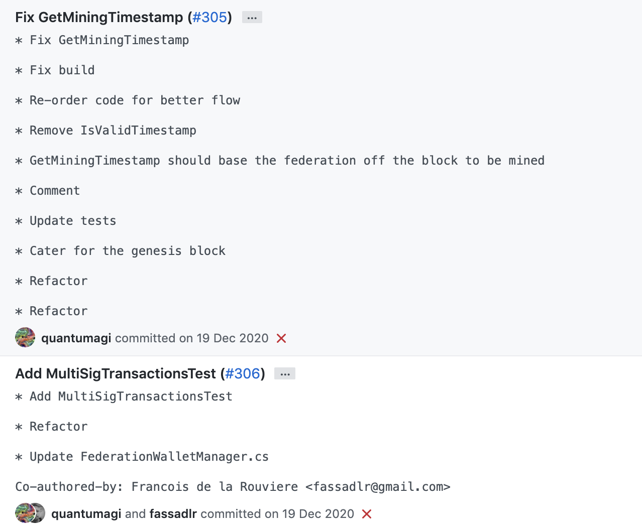 StratisFullNode 저장소와 같은 경우 다른 프로젝트를 포크해서 생성된 프로젝트가 아니고 실제 바닥부터 개발된 프로젝트는 확실합니다. 4년 전에 initial commit으로 프로젝트를 시작한 것을 확인할 수 있습니다. 초기 개발은 니콜라스 도리에(Nicolas Dorier, 세계 비트코인 전문가 14인 중 한 명)가 개발을 진행했고, 2017년 7월 13일 이후로 스트라티스 프로젝트에 실제 개발엔 참여하지 않는 것으로 확인됩니다. 중요한 사실은 기술력이 좋다는 것이 세계 비트코인 전문가라는 니콜라스 도리에라는 개발자가 참여했고, 스트라티스의 프로젝트를 직접 개발했다는 것에서 나왔던 것 같은데, 과연 기술력이 좋다는 것이 현재까지 유효한지는 한번 살펴봐야 될 것 같습니다.