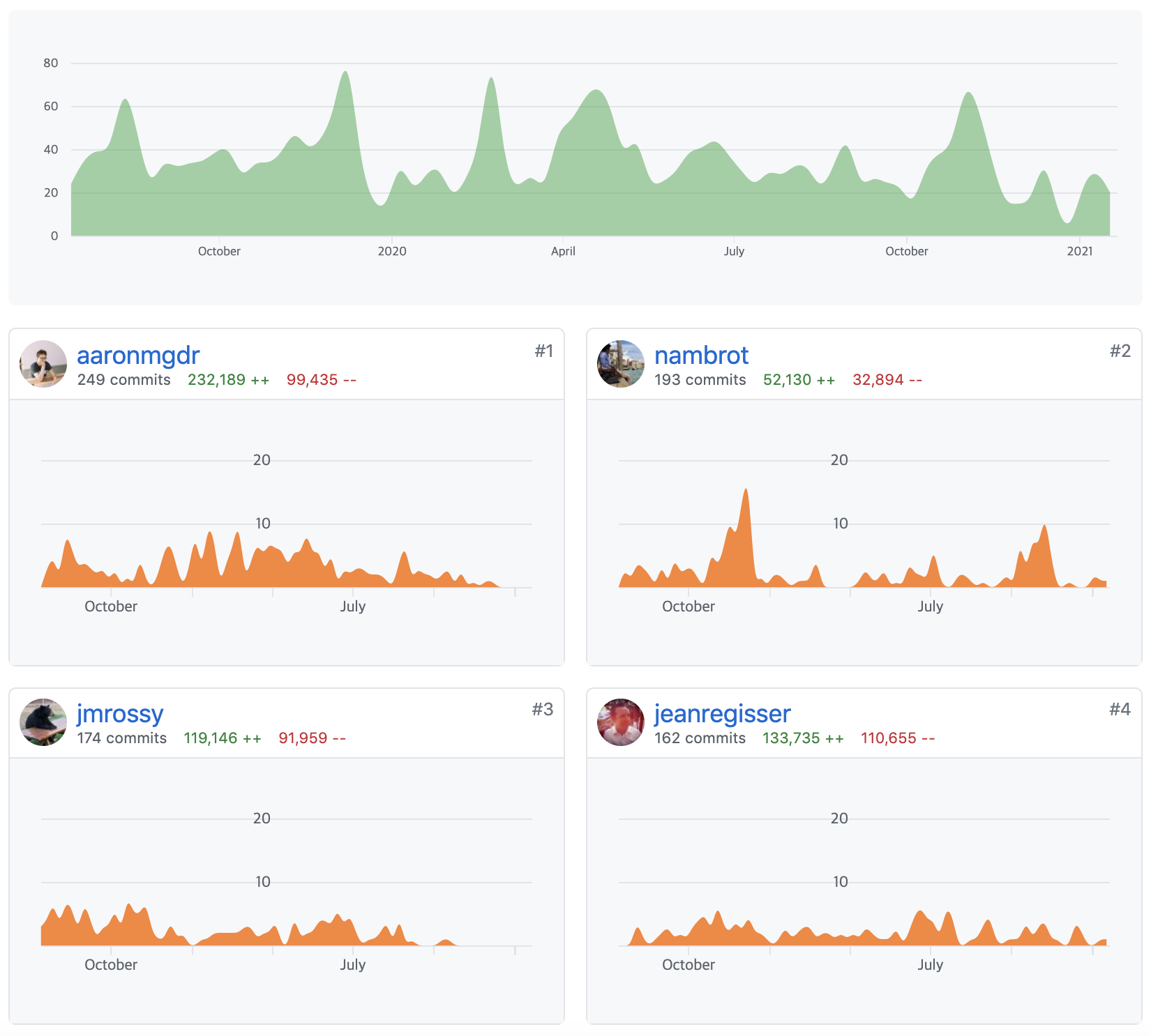 프로젝트 내에서 참여자들이 프로젝트 코드를 수정한 후 메시지를 남긴 개수입니다. 현재까지 프로젝트에 남겨진 커밋수는 5,081개로 2016년 9월 4일부터 진행된 프로젝트임을 감안하면(굉장히 오래된 프로젝트이긴 하네요) 커밋수는 굉장히 높은 편에 속합니다. (기준: 1일 1커밋, *프로젝트 참여자 수에 따라서 기준이 다를 수 있습니다.)