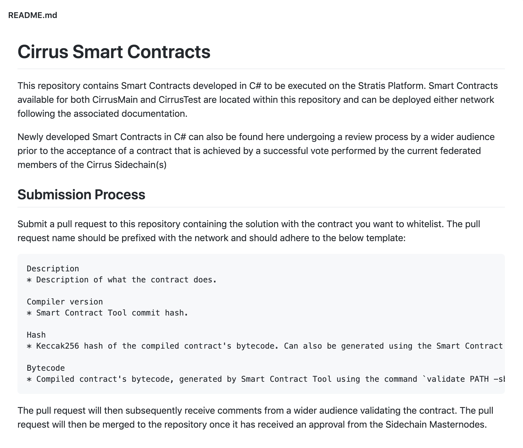 메인으로 다뤄볼 저장소 StratisFullNode를 다뤄보기 전에 잠깐 CirrusSmartContracts 저장소에 대해서 살펴보겠습니다. CirrusSmartContracts 저장소를 전체를 디테일하게 다루지 않고 간략하게 다루는 이유는 사실 길게 다룰만한 내용이 없기 때문입니다.