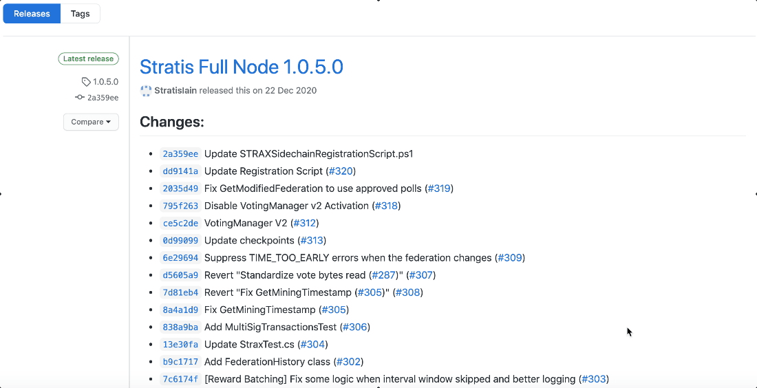 StratisFullNode 저장소의 커밋수에 비해서 Issues, PR, Tags 횟수가 굉장히 적은 것을 확인할 수 있습니다.