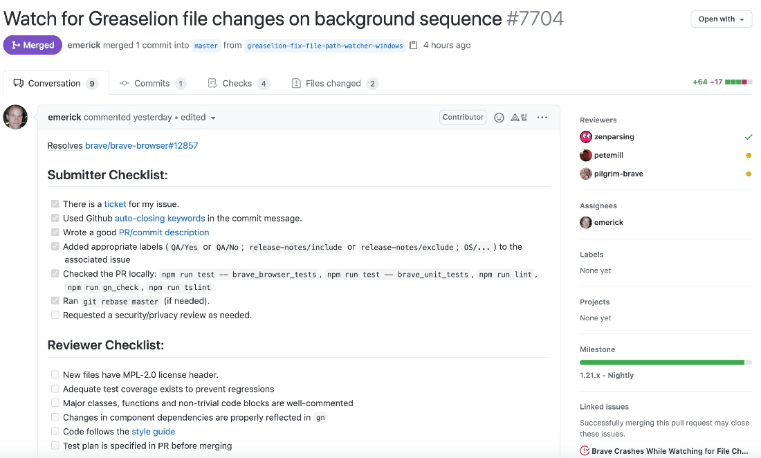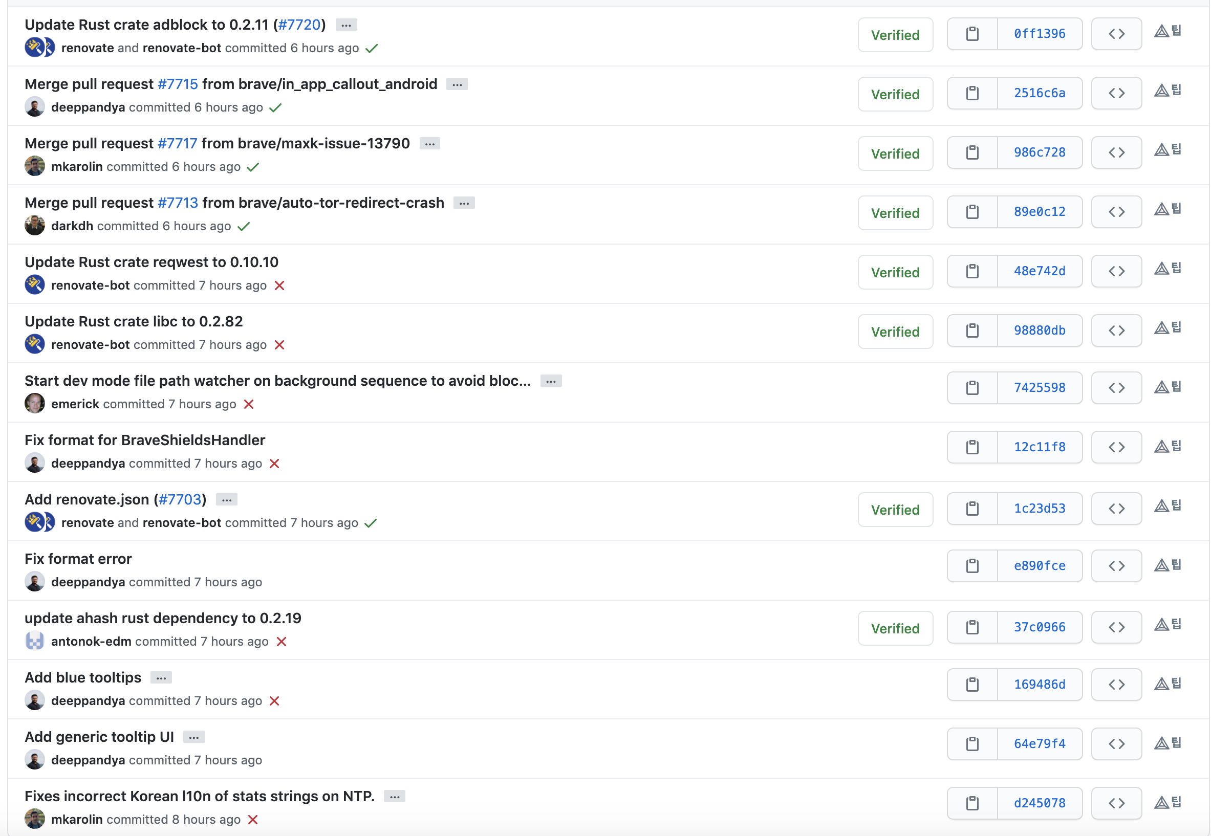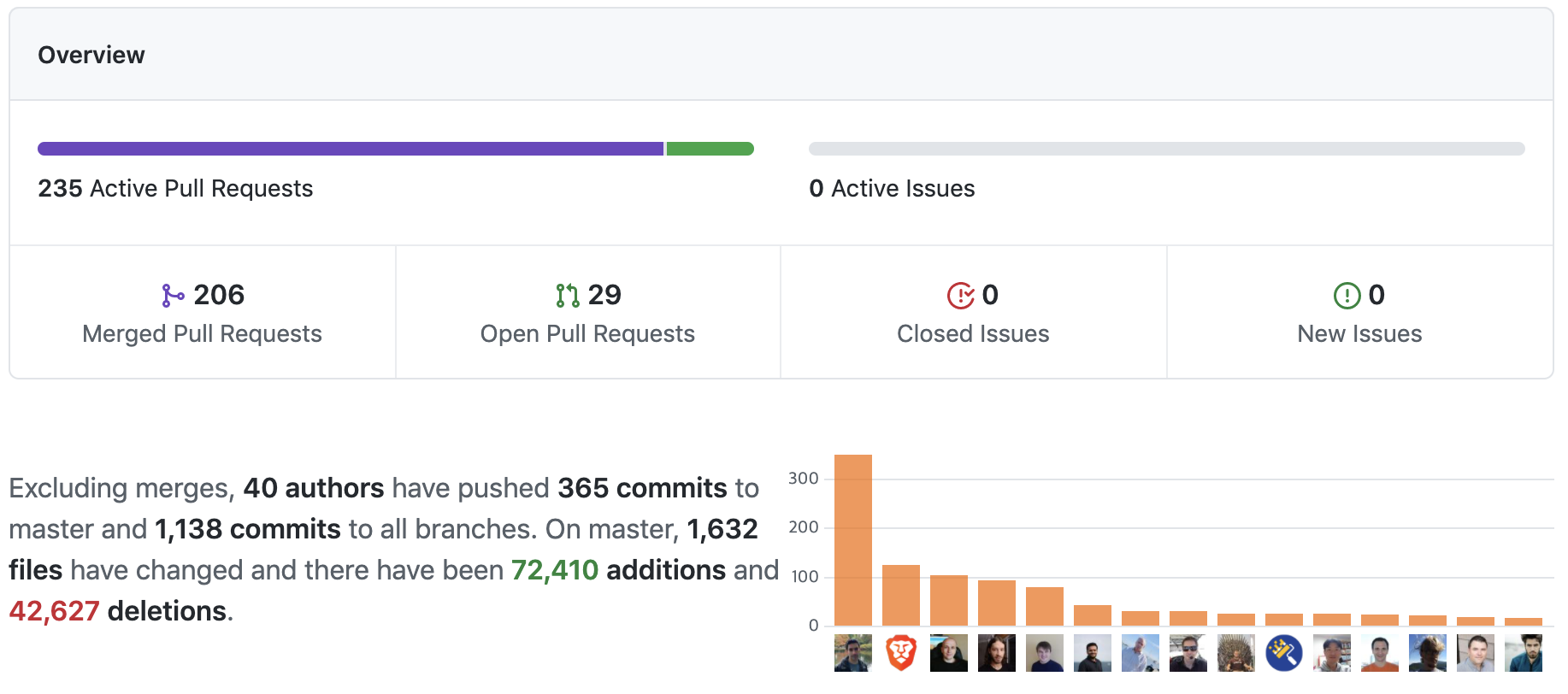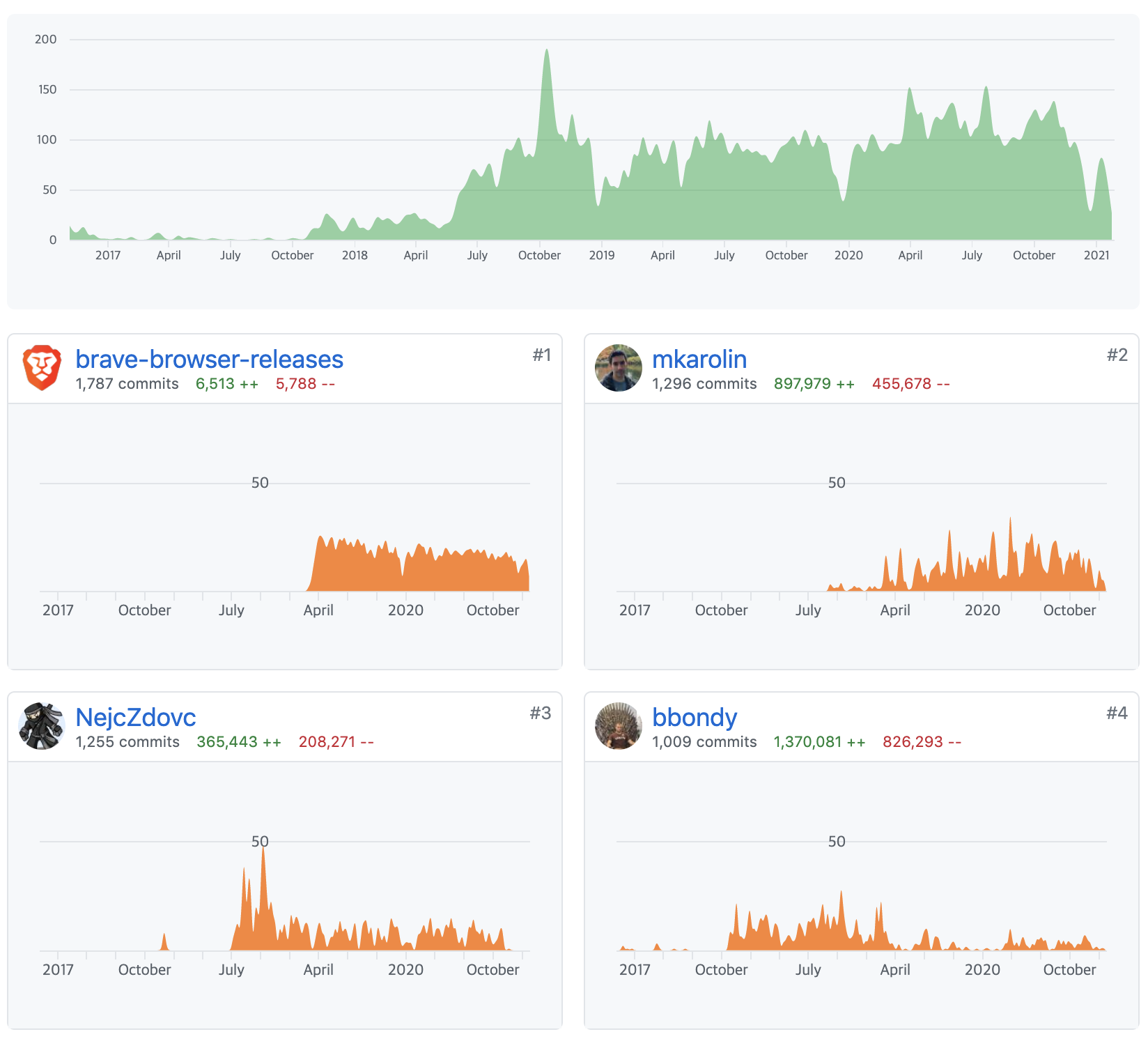 brave-browser 프로젝트가 훨씬 스타개수가 많지만, brave-core가 훨씬 핵심인 것 같으니 해당 프로젝트를 기반으로 개발 현황에 대해서 살펴보도록 하겠습니다.