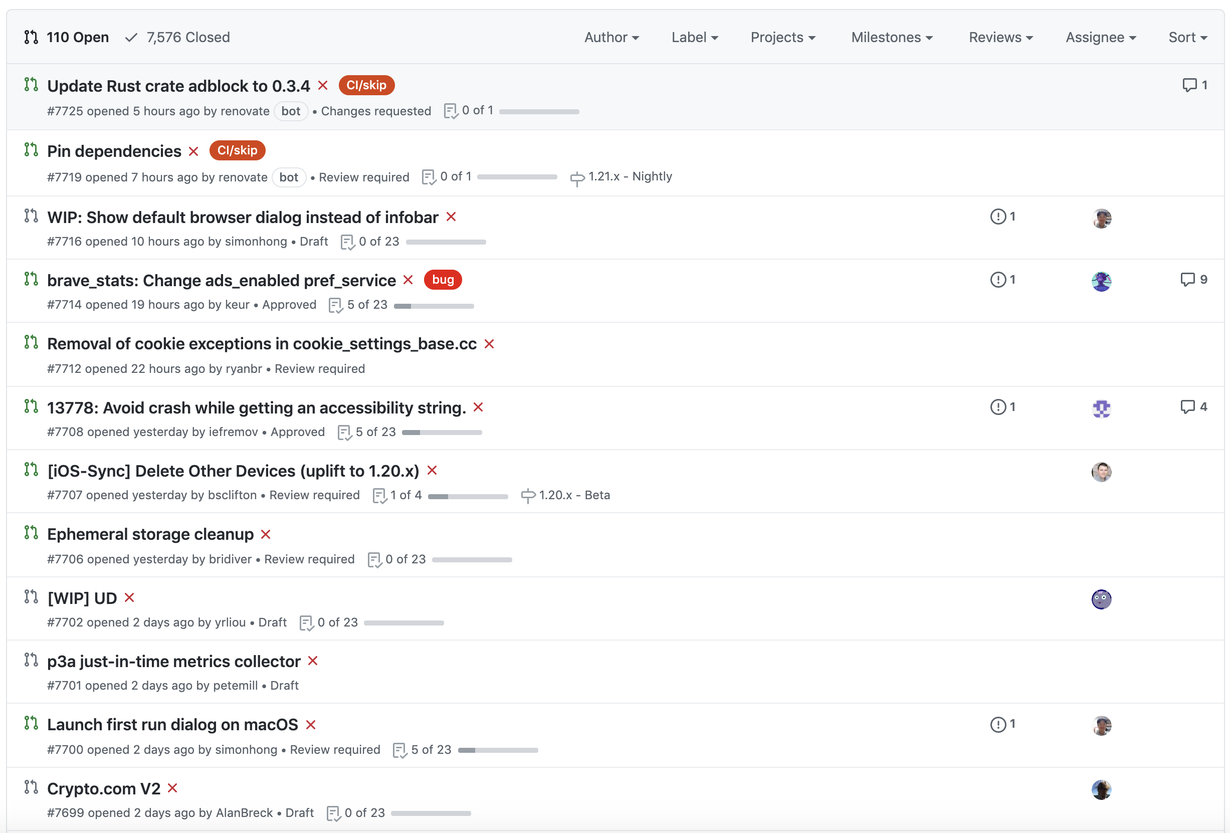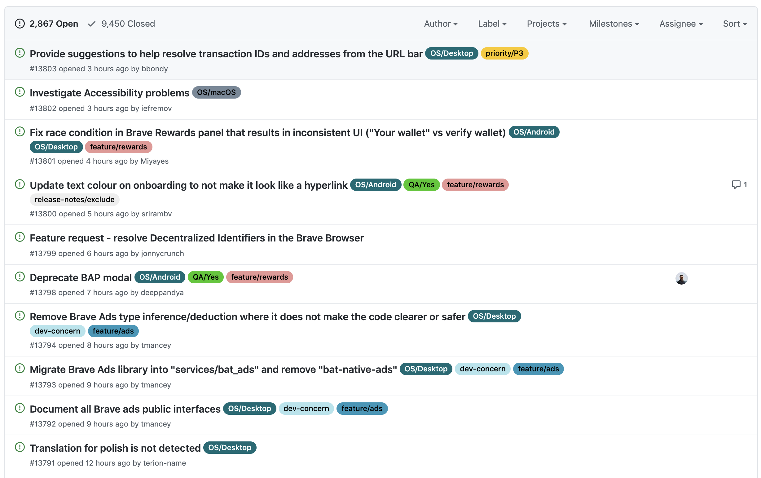 brave-core 이슈는 현재 비공개로 관리되고 있는 것 같고, 실제 타 프로젝트를 살펴보면 이슈 관리 또한 제대로 잘 진행하고 있는 것을 확인할 수 있으니 참고하시기 바랍니다. (brave-browser 프로젝트와 같은 경우 이슈가 2,867(9,450)건으로 어마어마합니다...ㅋㅋ)