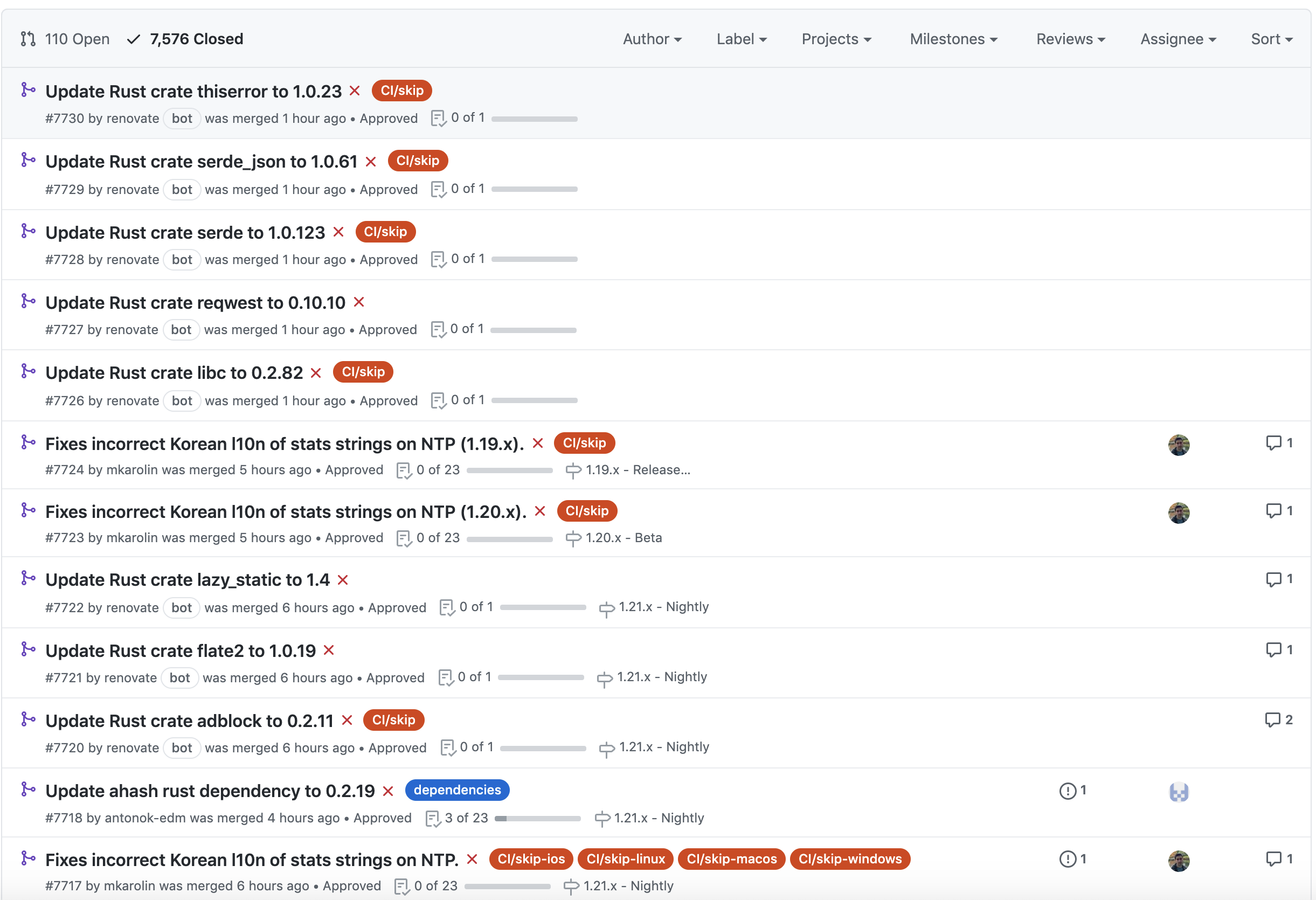 현재 프로젝트에서 열려있는 PR은 110건이고, 종료된 PR은 7,576건입니다. PR 횟수 또한 어마어마합니다.