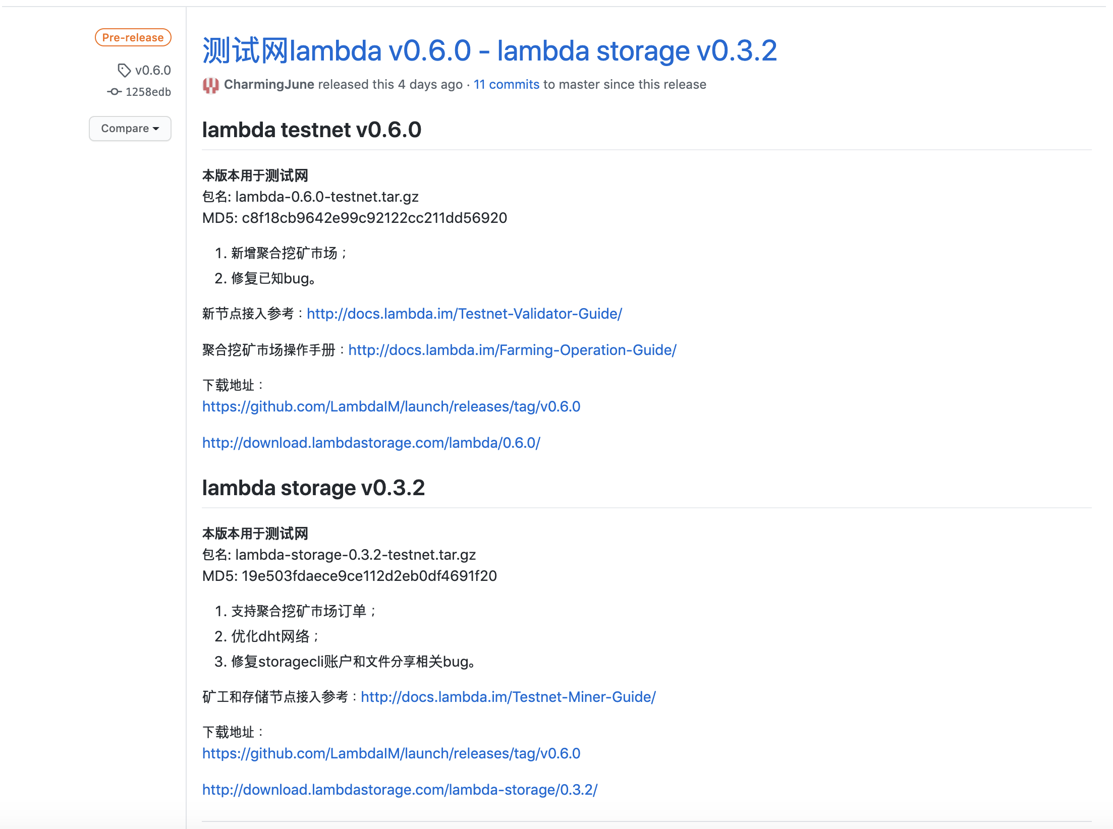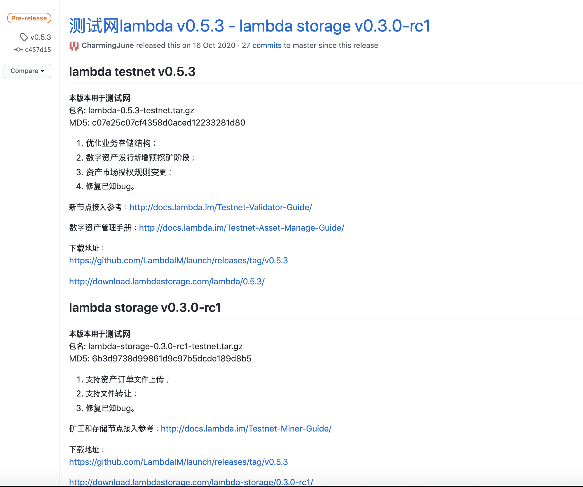 추측해보면 람다 launch 프로젝트는 비공개 저장소에서 작업된 결과물을 최종 공유하기 위해 제공되는 저장소인 것 같습니다. 개발팀이 비공개 저장소에서 람다 테스트넷 관련 업데이트를 진행한 후 릴리즈 시점에 깃허브 launch 프로젝트에 해당 릴리즈 다운로드 파일을 포함해서 업데이트하는 순서죠.