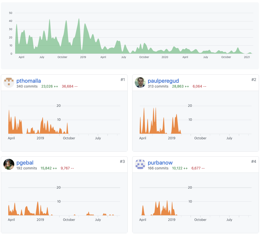 현재 프로젝트에서 열려있는 PR은 5건이고, 종료된 PR은 1,322건입니다. PR 횟수 또한 어마어마합니다.
