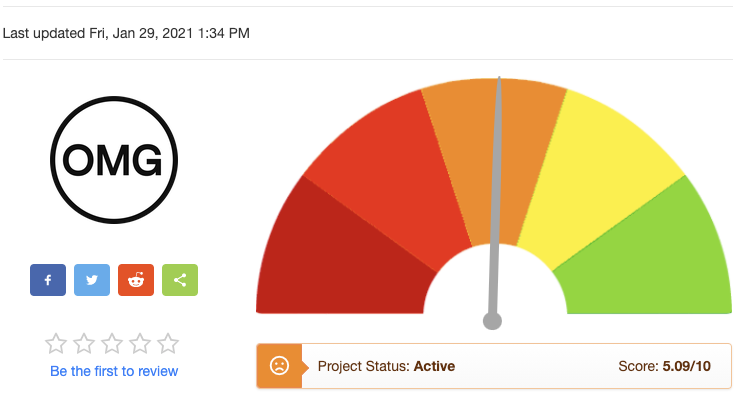 아래 스캠 판별 결과는 참고용으로만 봐주시면 좋을 것 같습니다. 기본적으로 코인 프로젝트에서 필수적으로 가져야할 요소들을 기준으로 스캠 판별을 해주는 사이트입니다. 오미세고 스캠 스코어는 5.09로 생각보다 점수가 낮은 것을 확인할 수 있습니다.