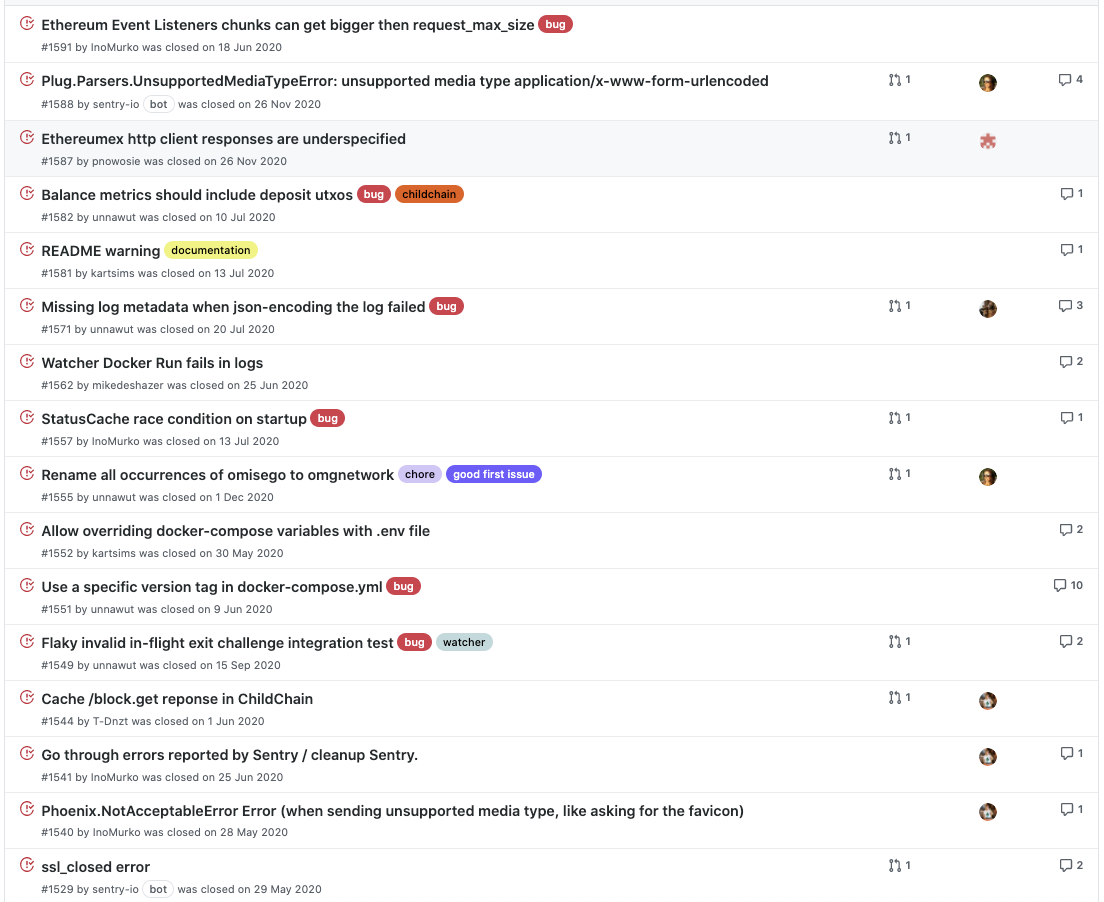프로젝트에서 가장 중요한 부분은 개인적으로 버그나 개선사항이 생겼을 때 이슈를 작성하고 관리하는 것이라고 생각합니다. 이슈를 활용해서 프로젝트에서 발생되는 모든 문제들을 관리할 수 있습니다. 프로젝트에서 이슈들까지 제대로 관리하고 있다면 해당 코인을 개발하는 개발진들의 개발 참여도는 굉장히 긍정적으로 보인다고 말씀드리고 싶습니다.
