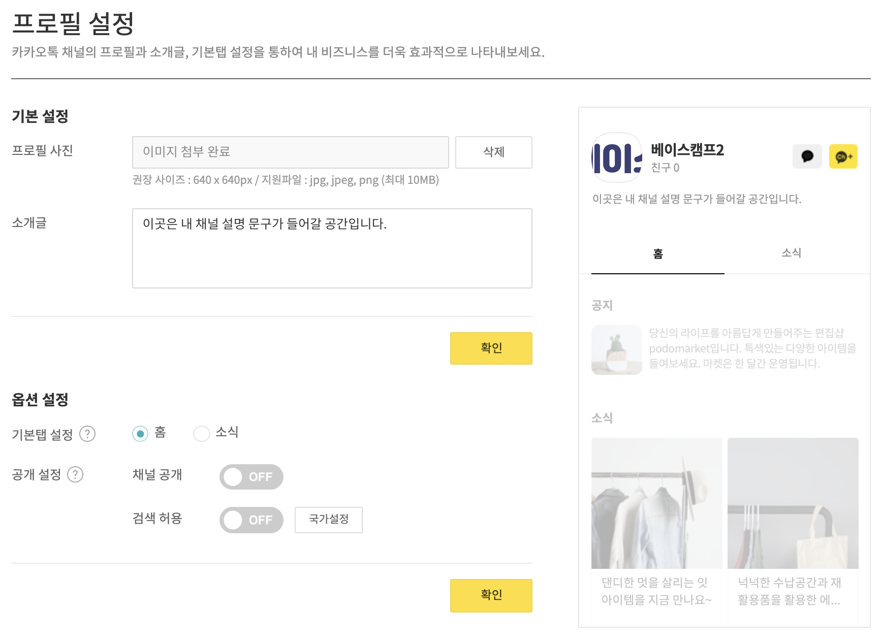 기본정보를 모두 기입했다면 아래 노란색 확인 버튼을 누르고 채널 정보 설정을 완료합니다.
