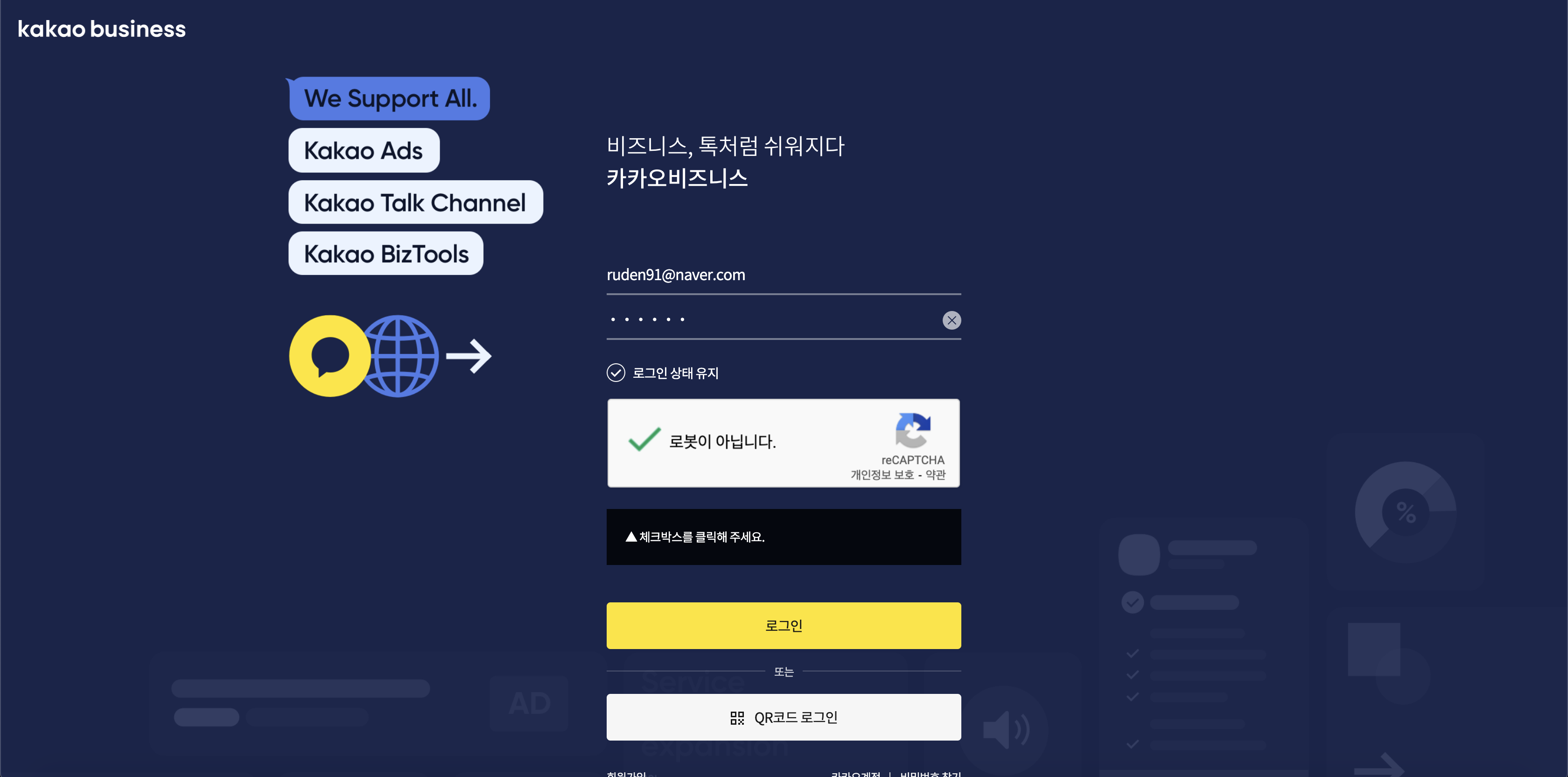 카카오톡채널 관리자센터로 이동하기 위해 카카오비즈니스 웹사이트로 접속합니다. 카카오비즈니스 웹사이트 접속 후 로그인하기 위해 카카오 계정 로그인을 진행해 주세요.