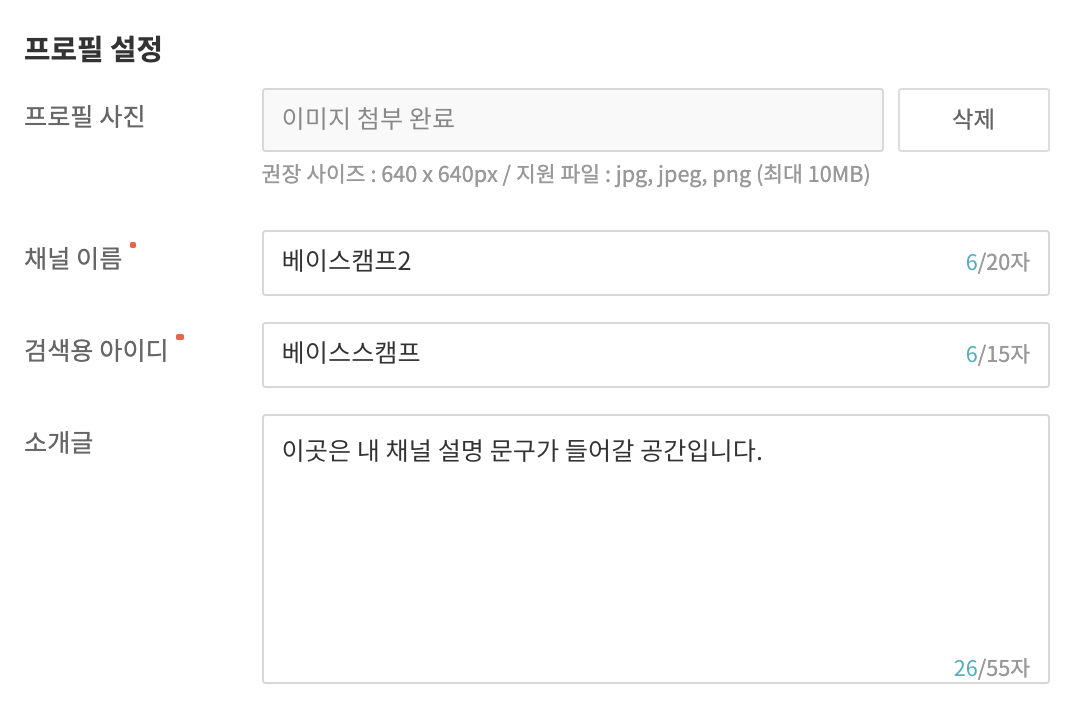 채널 개설을 위해 기본 정보를 기입하는 예시는 아래와 같습니다. 저와 같은 경우 사용할 이미지를 업로드한 후 채널 이름에 베이스캠프2 그리고 검색용 아이디를 베이스스캠프로 작성한 것을 확인할 수 있습니다. 소개글과 같은 경우 실제 사용자들에게 해당 채널 페이지를 소개할 문구입니다.