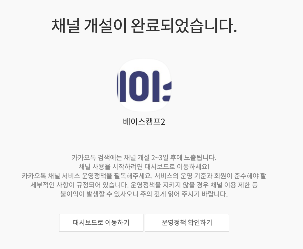 채널 개설이 완료되었다면, 카카오톡 검색에는 채널 개설 2~3일 후에 노출되는 점 참고하시기 바랍니다.
