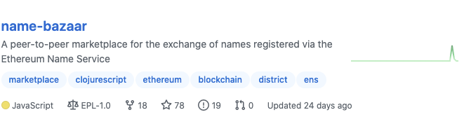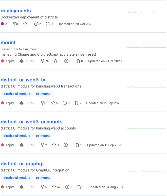 디스트릭트0x 프로젝트 업데이트 현황을 살펴보면 올해 5개의 프로젝트가 업데이트된 것을 확인할 수 있습니다. 각 저장소 우측의 업데이트 빈도 그래프를 살펴보면 활발하게 업데이트가 진행되고 있진 않는 것을 알 수 있습니다. 거의 업데이트가 이뤄지지 않았다고 봐도 무방합니다.