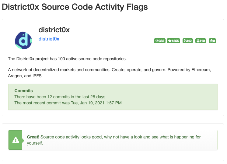 디스트릭트0x 코인은 공식 홈페이지에 깃허브 오픈소스 프로젝트 경로를 제공하고 있습니다. (개인적으로 당당하게 자신들이 개발하는 결과물을 오픈소스로 공개하는 곳을 굉장히 좋아합니다. 자신이 개발하고 있는 결과물에 떳떳하다는 것이겠죠. 스캠 취급을 당하지 않으려면 이러한 노력이 필요합니다.)