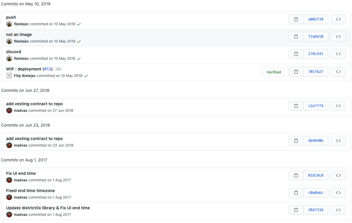 그나마 업데이트가 되고 있는 프로젝트가 Ethlance 저장소입니다. 하지만 해당 저장소 또한 자세히 살펴보면 업데이트가 그리 제대로 이뤄지진 않았던 것 같습니다.