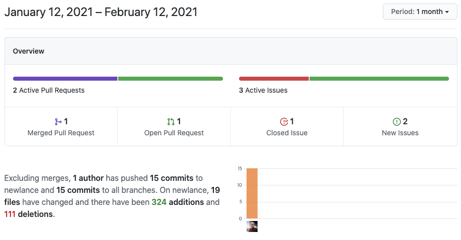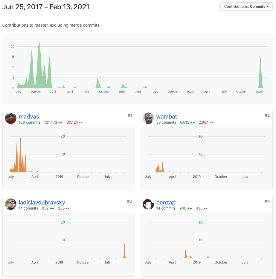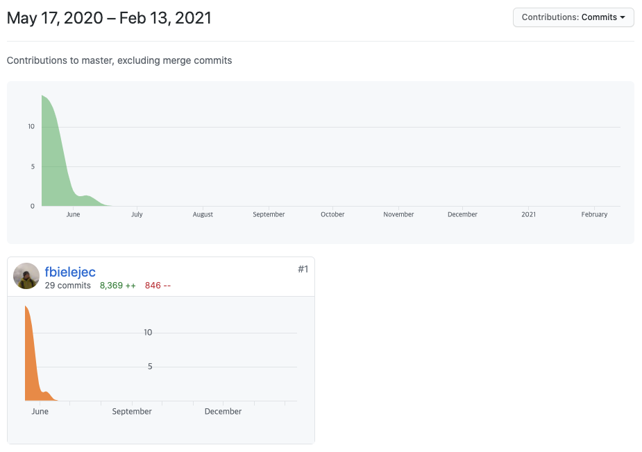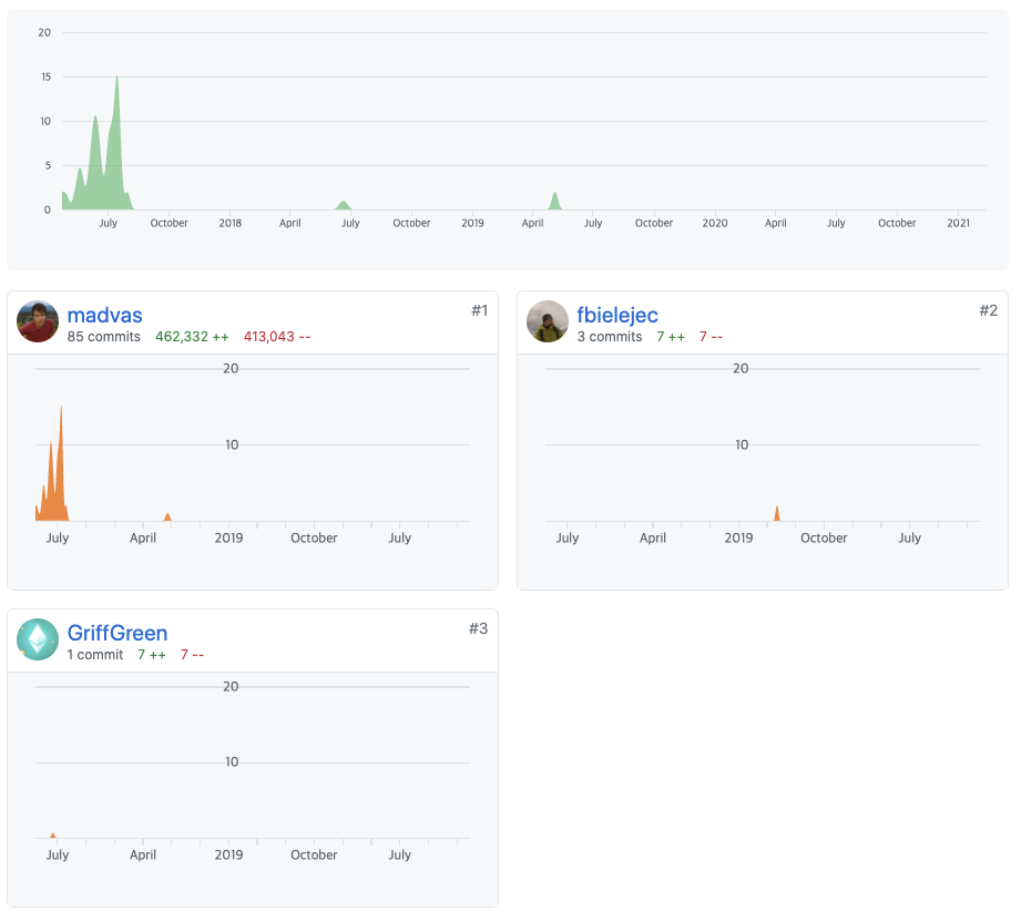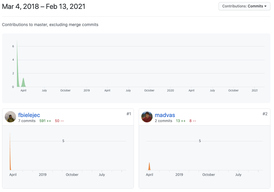 name-bazaar 저장소와 같은 경우 2017년 6월 25일부터 프로젝트가 진행되었으며 2018년부터 2021년 사이에 프로젝트가 진행되지 않았다가 최근에 커밋 몇개가 추가된 모습입니다. 최근에 왜 갑자기 개발을 다시 진행하게 되었는지는 모르겠지만 그 사이에 개발이 잘 진행되지 않은 것을 확인할 수 있습니다.