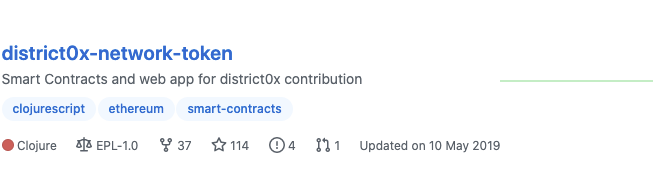올해 업데이트된 프로젝트가 몇 없기 때문에 한번 다 체크해보도록 하겠습니다. 메인프로젝트 district0x-network-token 저장소는 2019년에 개발이 완료된 후 업데이트가 이뤄지지 않는 것을 확인할 수 있습니다. 아마 ICO를 진행하기 위해 2017년에 솔리디티로 토큰개발을 진행한 후 개발이 종료된 모습입니다.