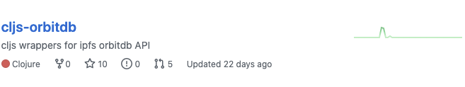 cljs-orbitdb 저장소와 같은 경우 2020년 5월 17일에 프로젝트가 생성되고 29개의 커밋 히스토리를 남기고 현재까지 개발이 진행되고 있지 않습니다.