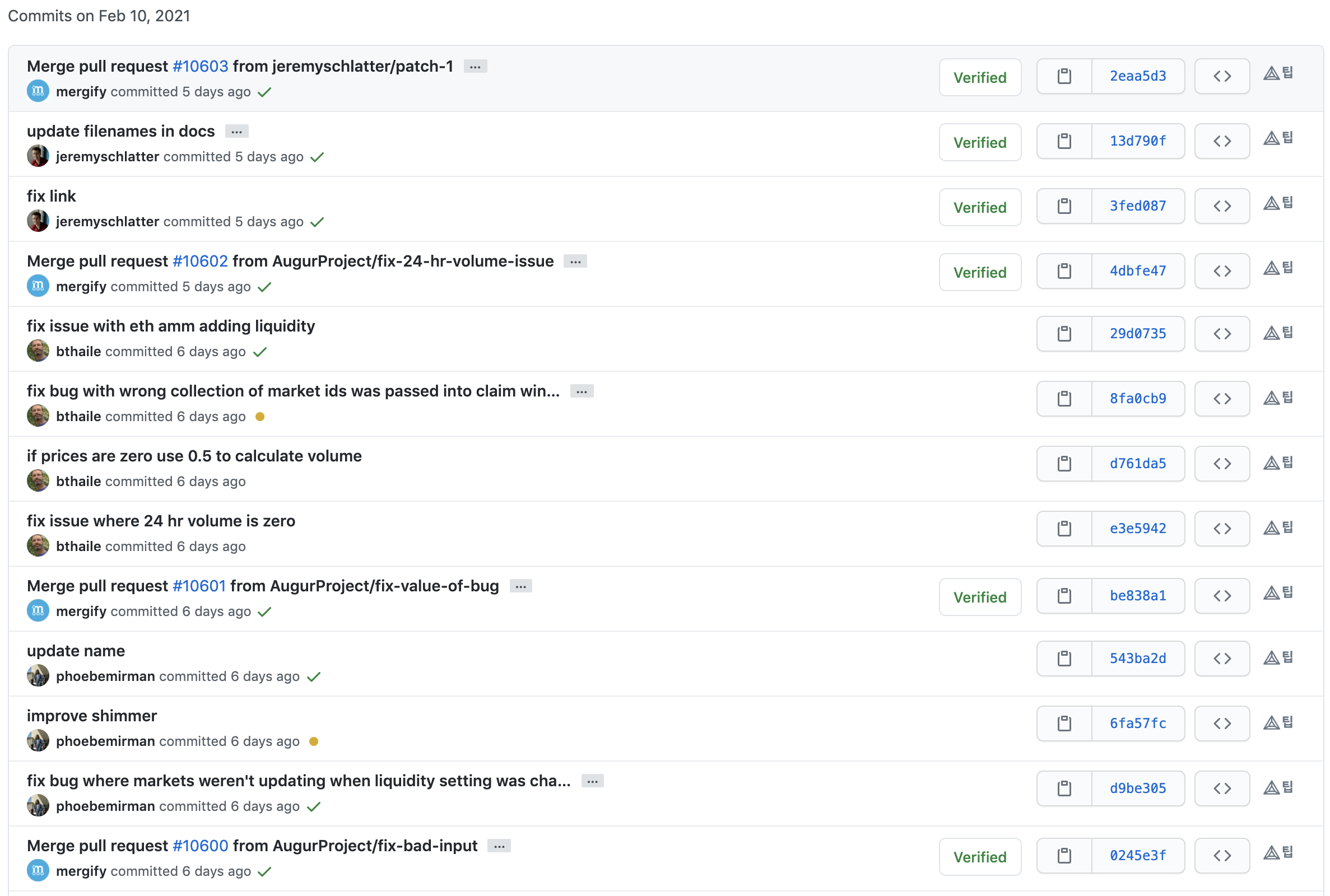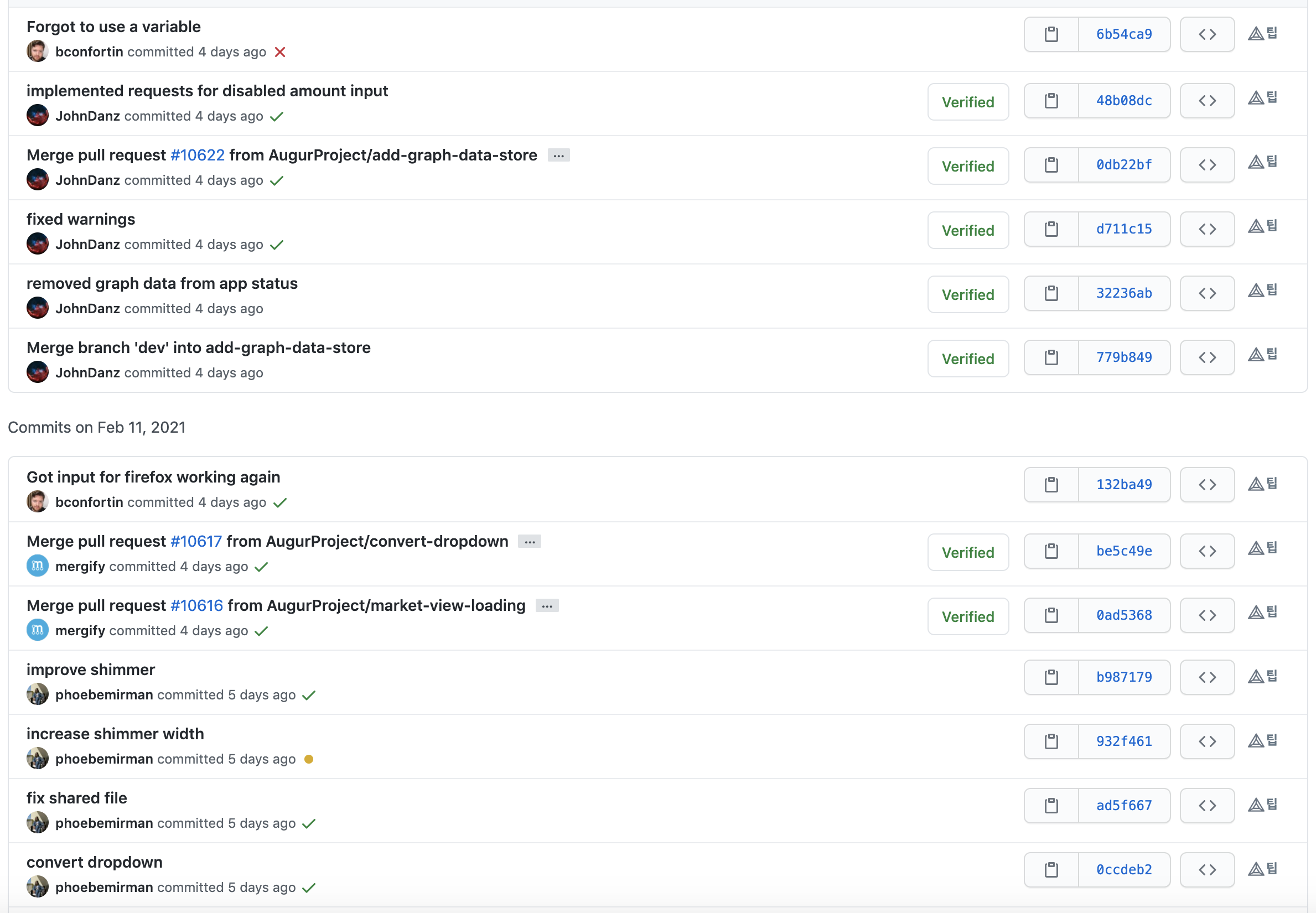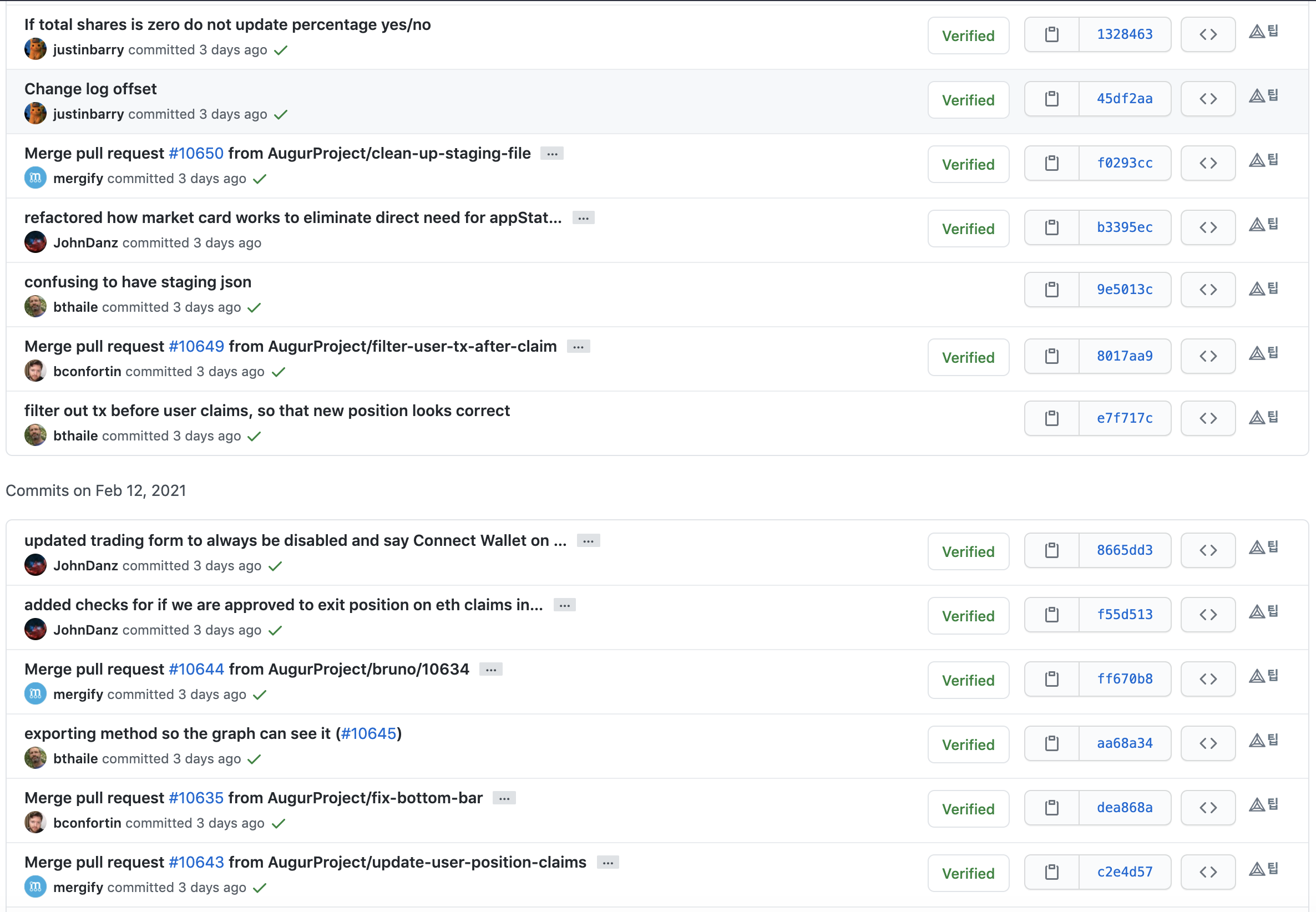 커밋수가 굉장히 많은 이유가 이렇게 조그마한 수정사항들을 모두 커밋을 쪼개서 작성했기 때문에 그랬던 것 같습니다. 최근 수정사항들이 프론트엔드 리액트 라이브러리 컴포넌트의 스타일들이 대부분이라 코인 관련 코드 개선이라고는 보기 어렵습니다. (프로젝트 설명에 Prediction Market Protocol and Client를 다시 읽어보니 이해가 됩니다. Client가 클라이언트 사이드 프로젝트라는 뜻으로 이해하면 되군요.)