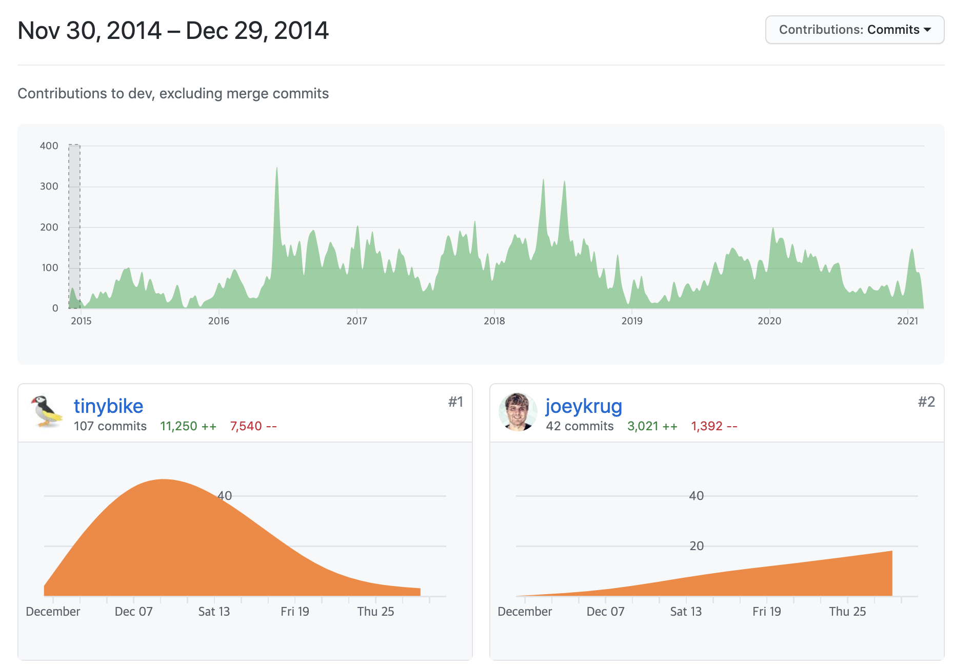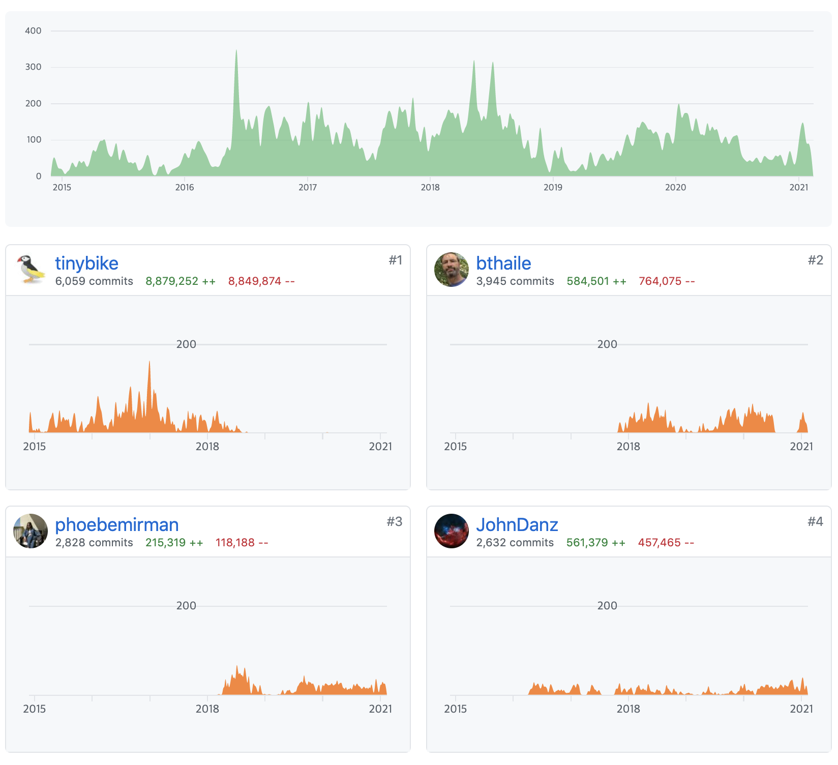 프로젝트 내에서 참여자들이 프로젝트 코드를 수정한 후 메시지를 남긴 개수입니다. 현재까지 프로젝트에 남겨진 커밋수는 44,353개로 2014년 11월 30일부터 진행된 프로젝트임을 감안하면 굉장히 높은 커밋수입니다. (기준: 1일 1커밋, *프로젝트 참여자 수에 따라서 기준이 다를 수 있습니다.) 또한 프로젝트가 굉장히 오래 전부터 지속되어온 것을 확인할 수 있습니다.