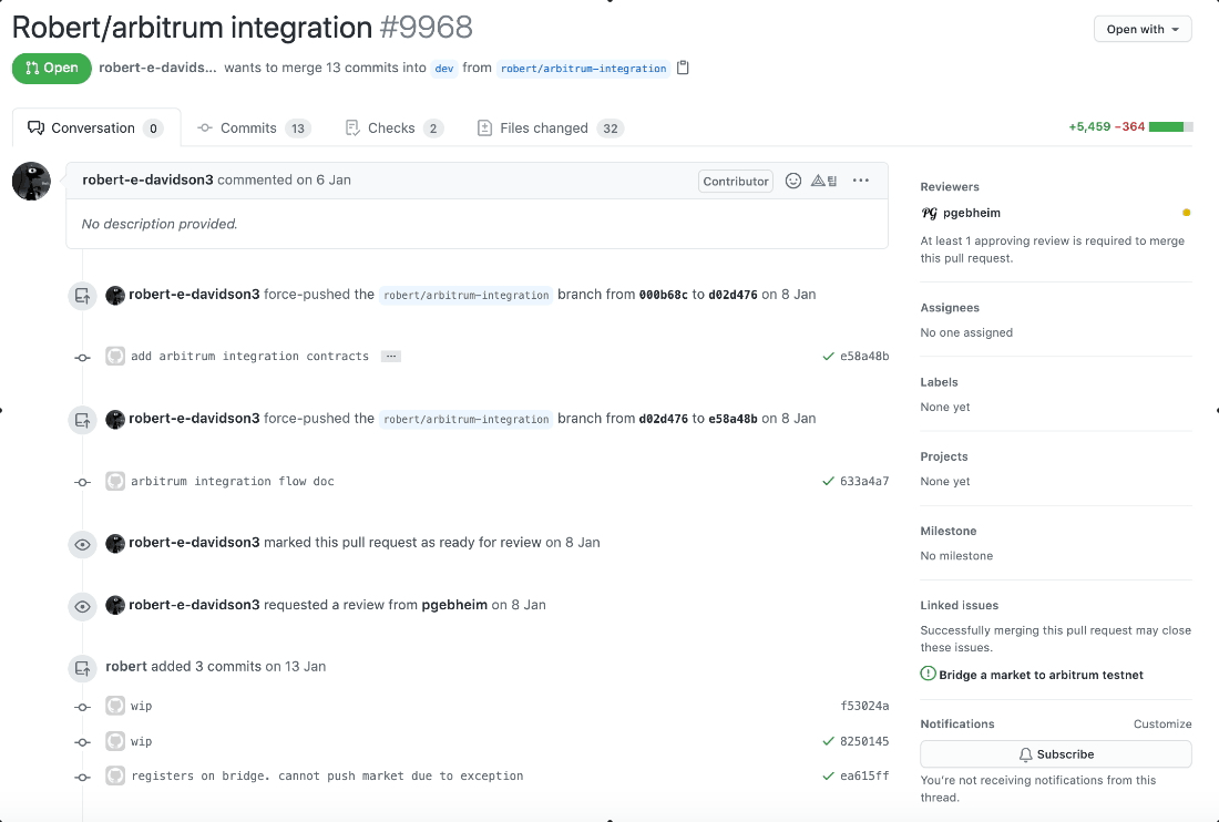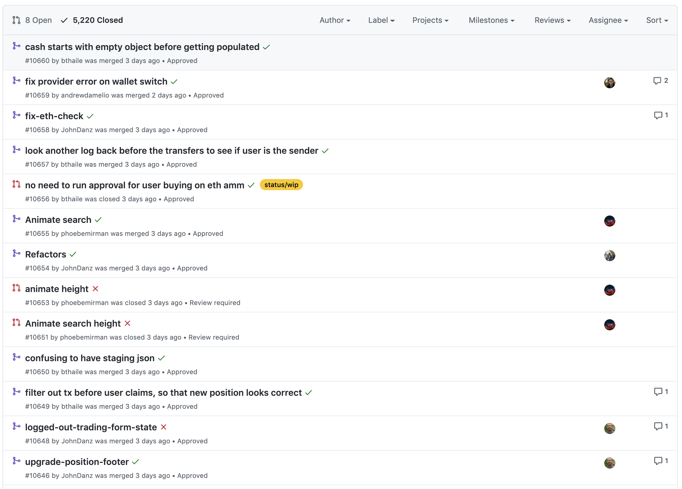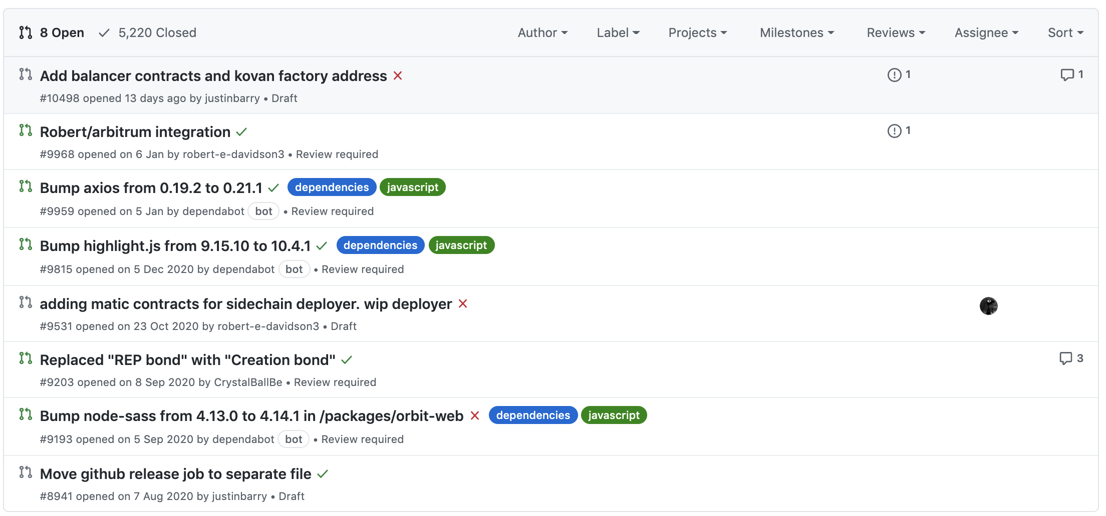 현재 프로젝트에서 열려있는 PR은 8건이고, 종료된 PR은 5,220건입니다. 이슈와 비슷하게 PR 목록들을 살펴보면 딱히 개발팀끼리 커뮤니케이션을 통한 리뷰는 없는 것을 확인할 수 있습니다. 열려있는 PR중에 3건은 dependabot으로 깃허브에서 의존성 패키지를 업데이트하기 위해 자동으로 생성되는 녀석들이라 제외하셔도 됩니다.