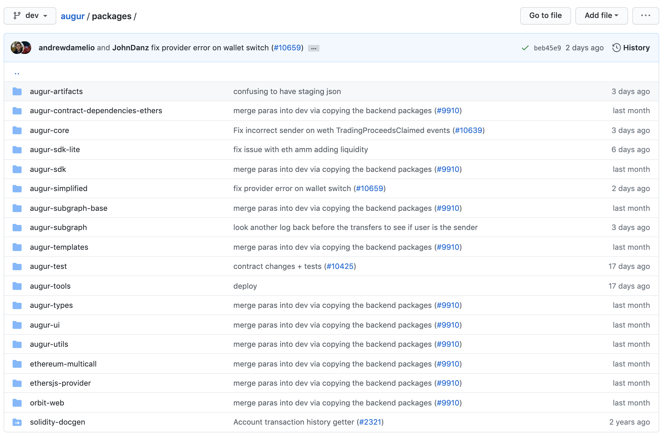 어거의 모든 프로젝트가 augur/packages에서 모두 관리되고 있는 것 같네요. 해당 폴더에 굉장히 많은 어거 패키지들이 존재하는 것을 알 수 있습니다. (왜 모든 프로젝트를 하나의 저장소에서 관리하고 있을까요?.. 뭐 이렇게 관리하는게 편했으니까 개발팀이 이런 결정을 했겠죠? 하지만 어느정도 관심사의 분리는 필요할 것 같은데, 뭐 관점의 차이같으니 이해하고 넘깁니다.)
