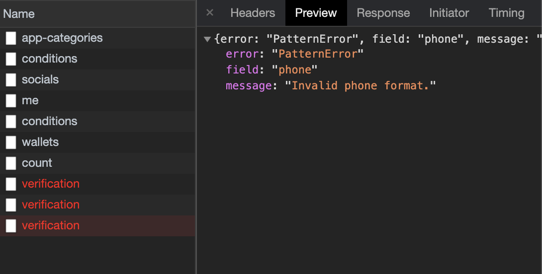 내 프로필에서 휴대폰 등록을 하려고 했으나 인증번호가 날아오지 않습니다. 기본적인 휴대폰 인증 로직이 제대로 작동하지 않는 것을 확인할 수 있습니다. 알고보니 +82처럼 국가코드까지 기입해야 휴대폰 인증이 가능했습니다. 에러 메시지가 나오지 않아 브라우저 네트워크를 확인하고서야 원인을 알았네요.