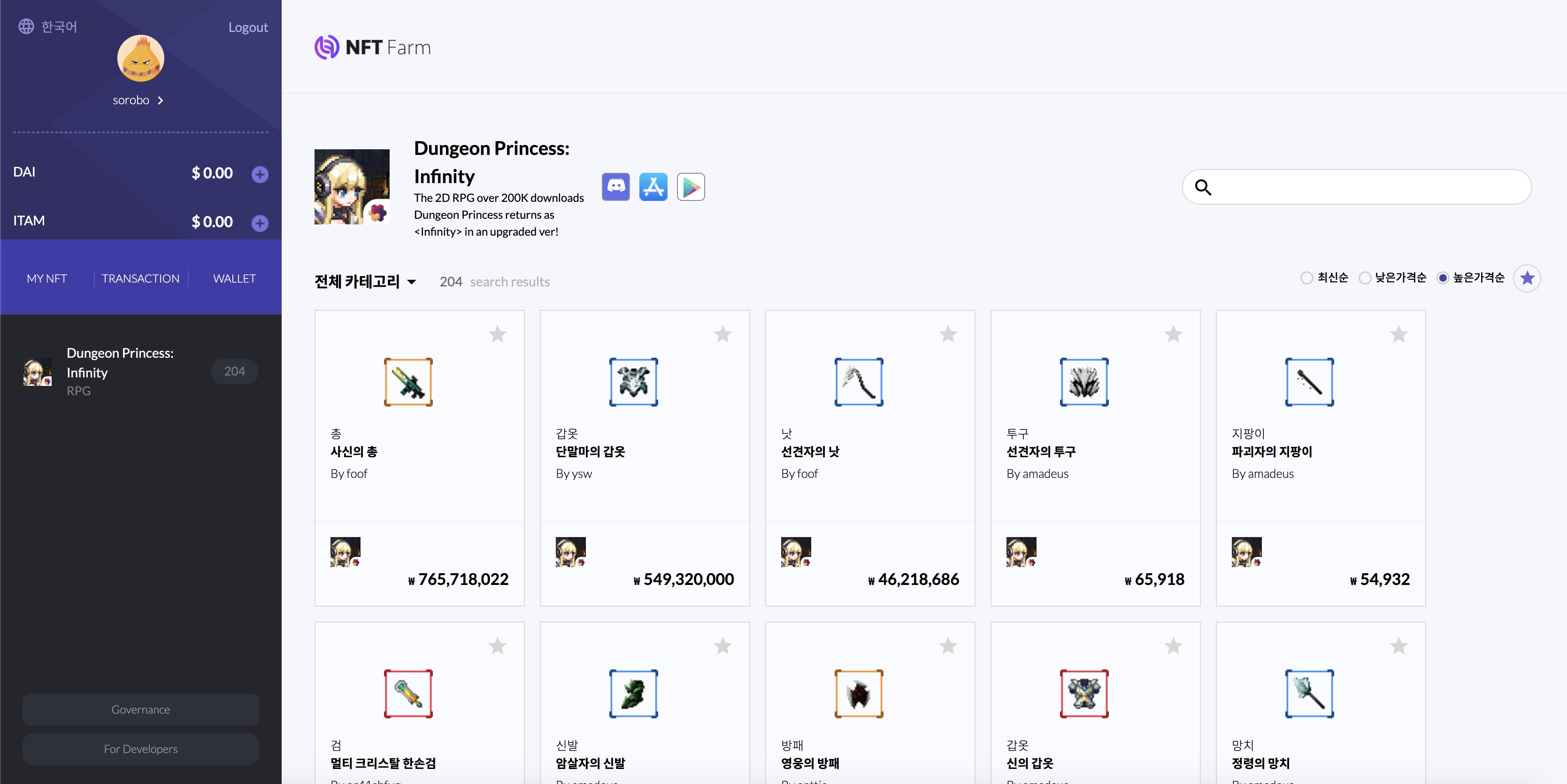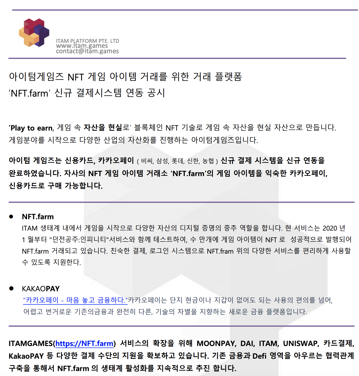 아이텀게임즈에서는 NFT 게임 아이템 거래를 위한 거래 플랫폼인 NFT Farm을 개발한 것을 알 수 있습니다.