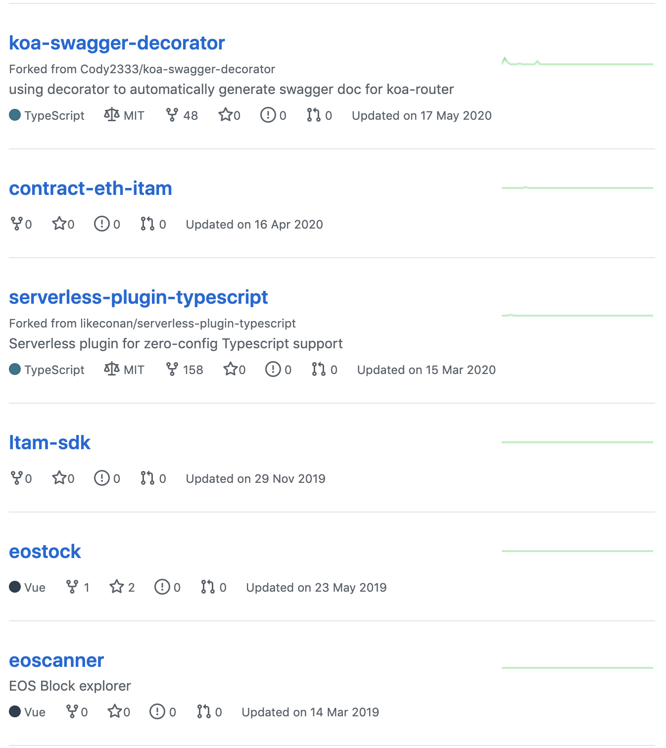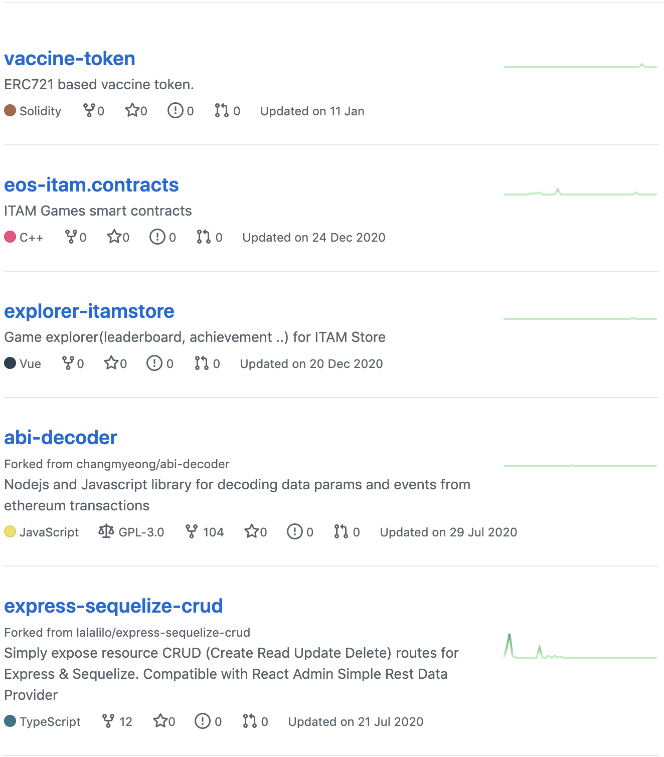 아이텀게임즈 프로젝트 전체 업데이트 현황을 살펴보면 현재 업데이트되고 있는 프로젝트는 존재하지 않습니다. 게임에 유통할 토큰만 개발한 후 코인 관련 개발은 딱히 진행하지 않는 것으로 보이네요. 코인 개발과 관련된 기술력은 살펴볼 수 없습니다. 대다수의 프로젝트들이 타 프로젝트를 포크한 프로젝트고, 꽤 오래 전에 생성된 프로젝트인 것을 확인할 수 있습니다.