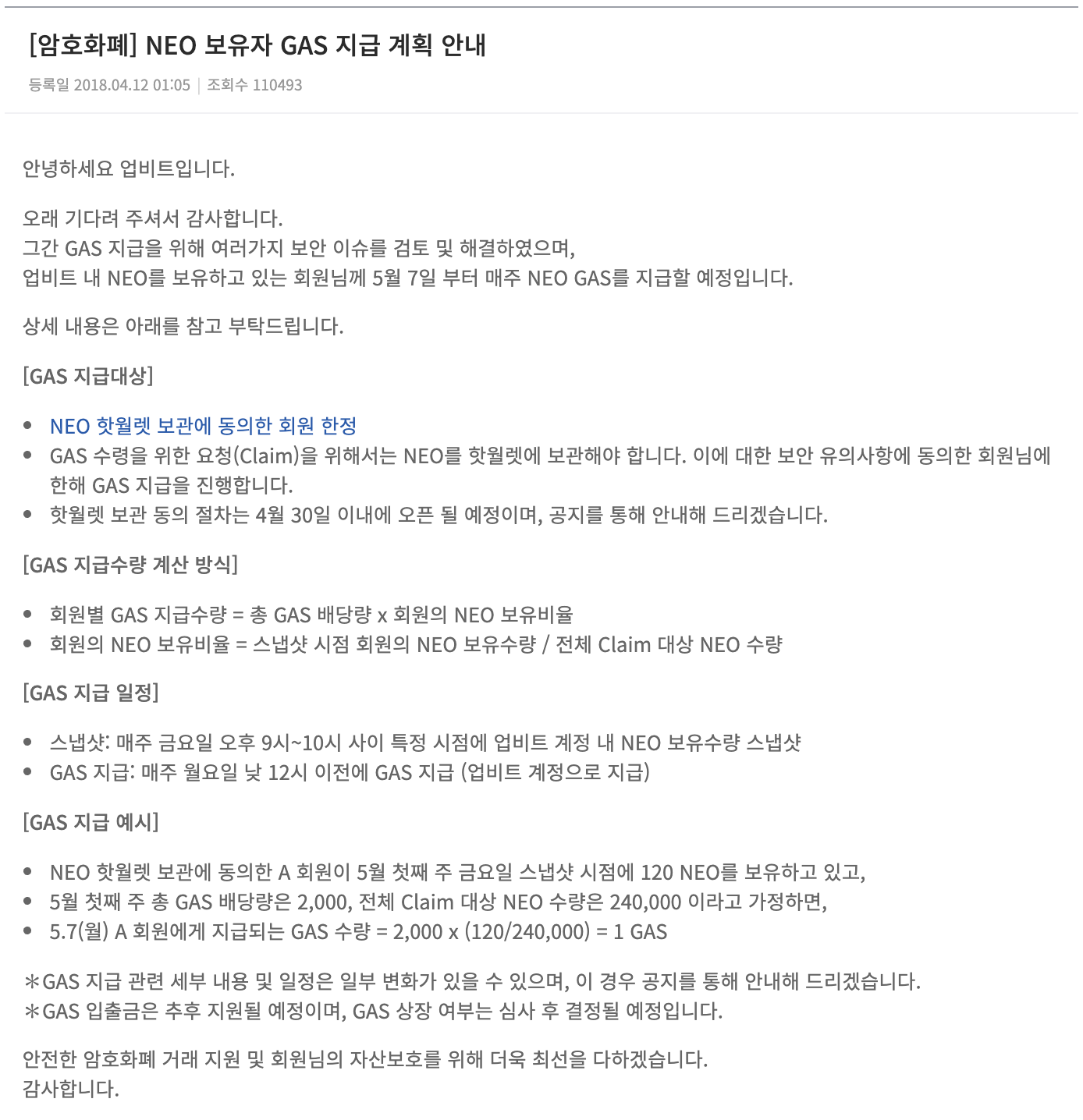 참고로 네오가스의 경우 시가총액이 굉장히 가벼운 토큰이기 때문에 펌핑으로 훅 날아가거나 다시 훅 떨어질 수 있으니 투자에 유의하셔야 합니다. 기본적으로 네오를 투자하면 가스는 업비트에서도 월에 한번씩 정산해주기 때문에 네오가스를 직접투자하는 방식도 있지만 네오 코인에 투자를 함으로써 네오가스를 이자로 지급받는 식의 투자도 가능합니다.