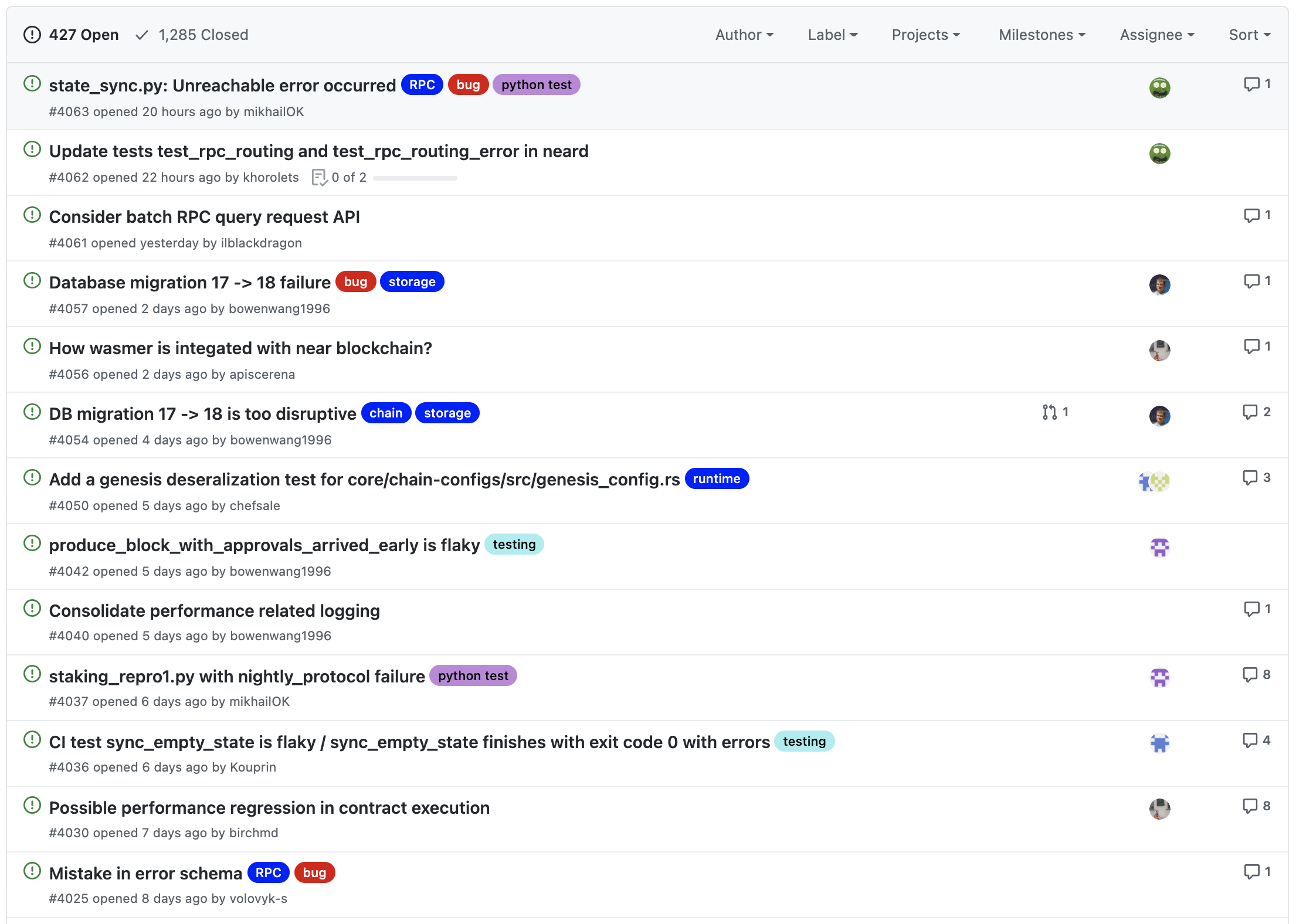 현재 프로젝트에 427개의 이슈가 열려있고, 1,285개의 이슈가 해결되었습니다.
