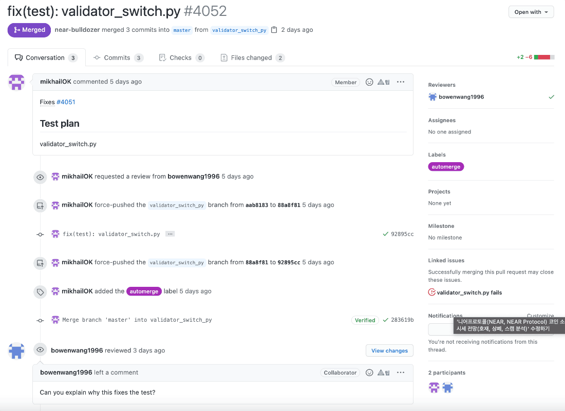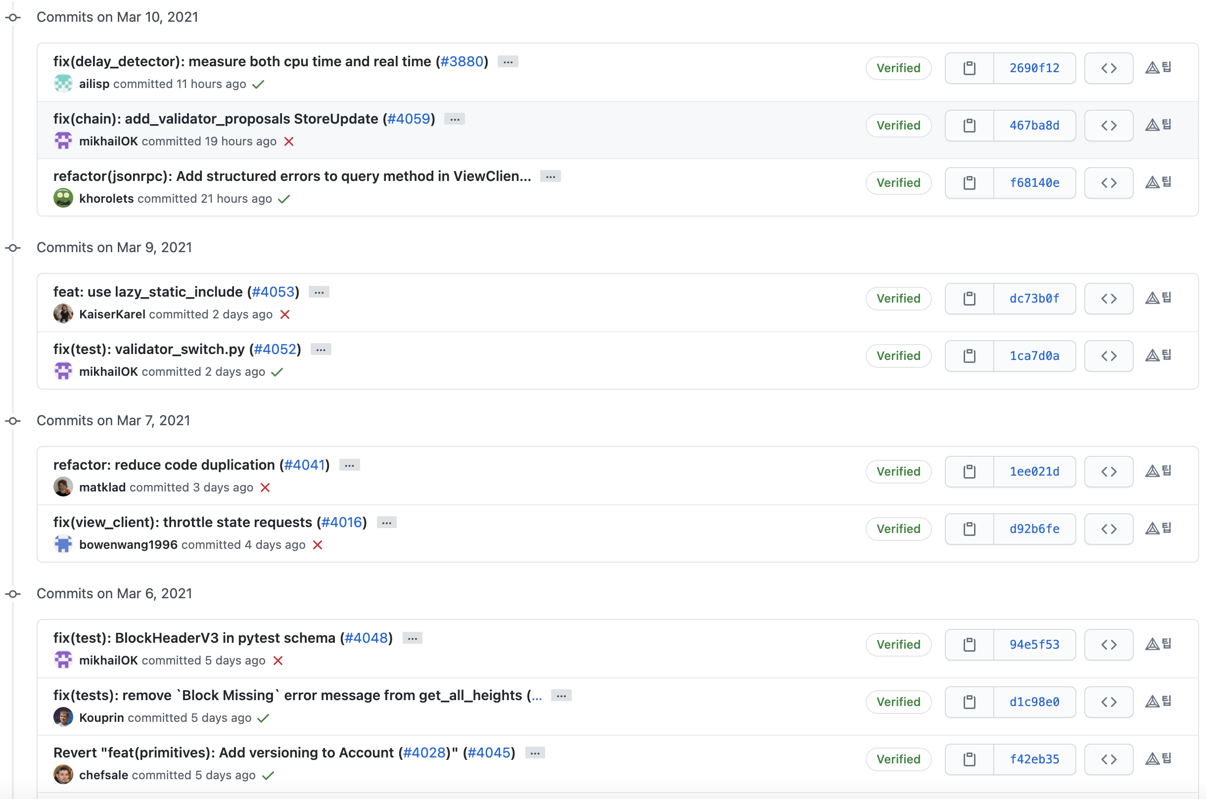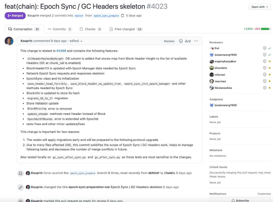커밋 메시지 히스토리를 살펴보면 니어 프로토콜 개발팀은 내부 커밋 메시지 컨벤션이 존재하는 것 같습니다. 메시지를 굉장히 명시적으로 잘 작성했고, 팀원들끼리 컨벤션에 맞춰 굉장히 깔끔하게 잘 작성해주고 있는 것을 확인할 수 있습니다. (제가 개인적으로 굉장히 좋아하는 메시지 컨벤션입니다!)