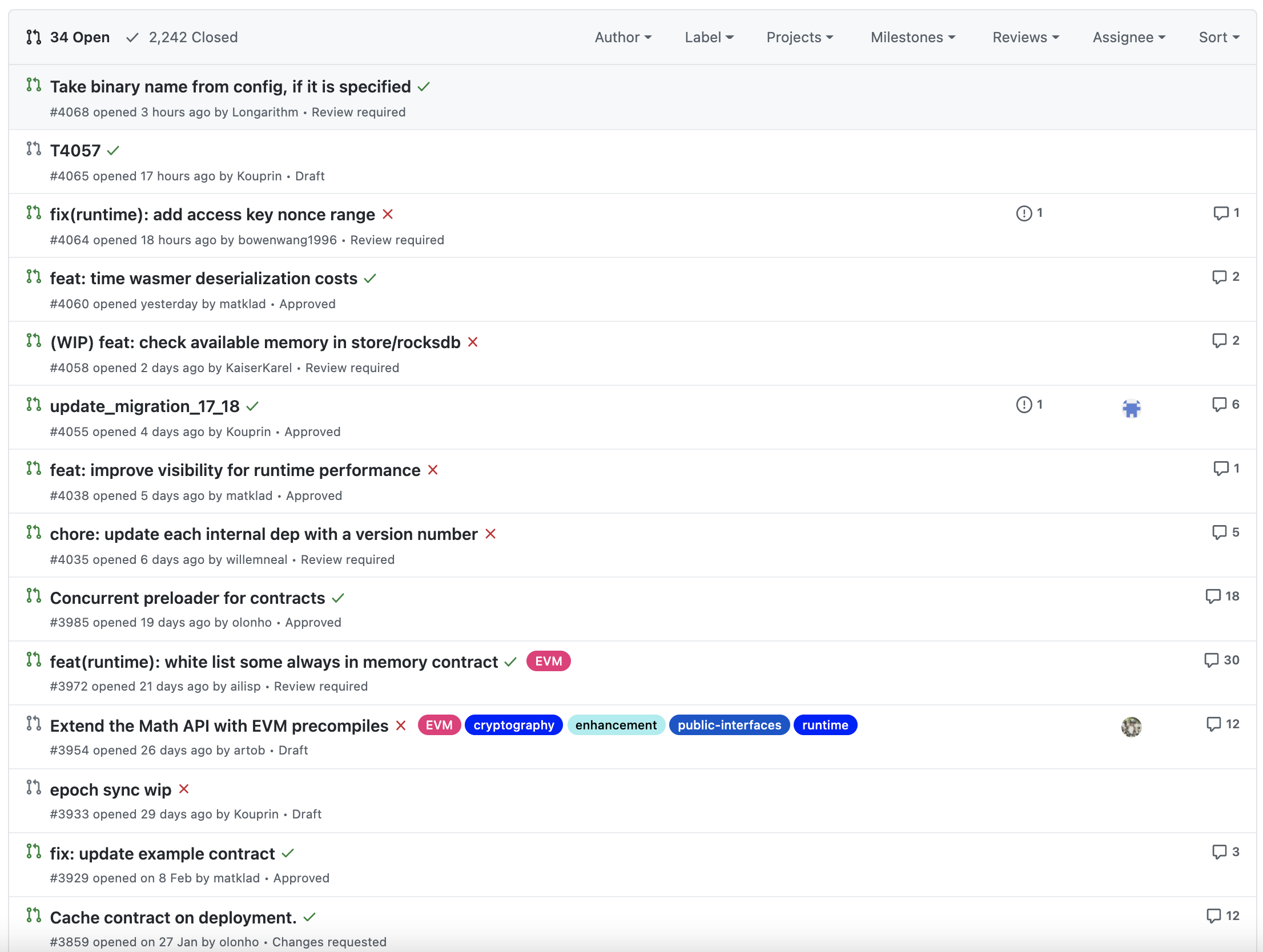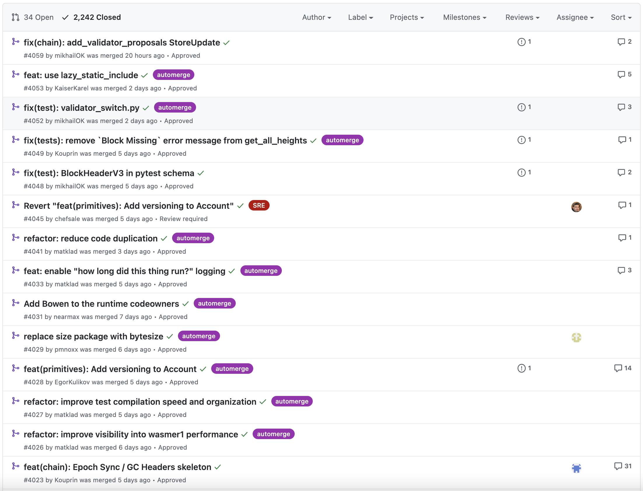현재 프로젝트에서 열려있는 PR은 34건이고, 종료된 PR은 2,242건입니다. 여기서 확인할 포인트는 PR이 단순히 많다고 좋은 것이 아니라 PR이 열려있다면, 해당 PR들이 언제 열렸는지, 현재 코드리뷰가 되고 있는지를 확인하는 것입니다. PR이 열린지 꽤 되었음에도 코드리뷰가 되지 않고, 마스터 브랜치에 병합되지 않았다는 것은 프로젝트 PR 관리가 제대로 안되고 있다는 것을 확인할 수 있죠.