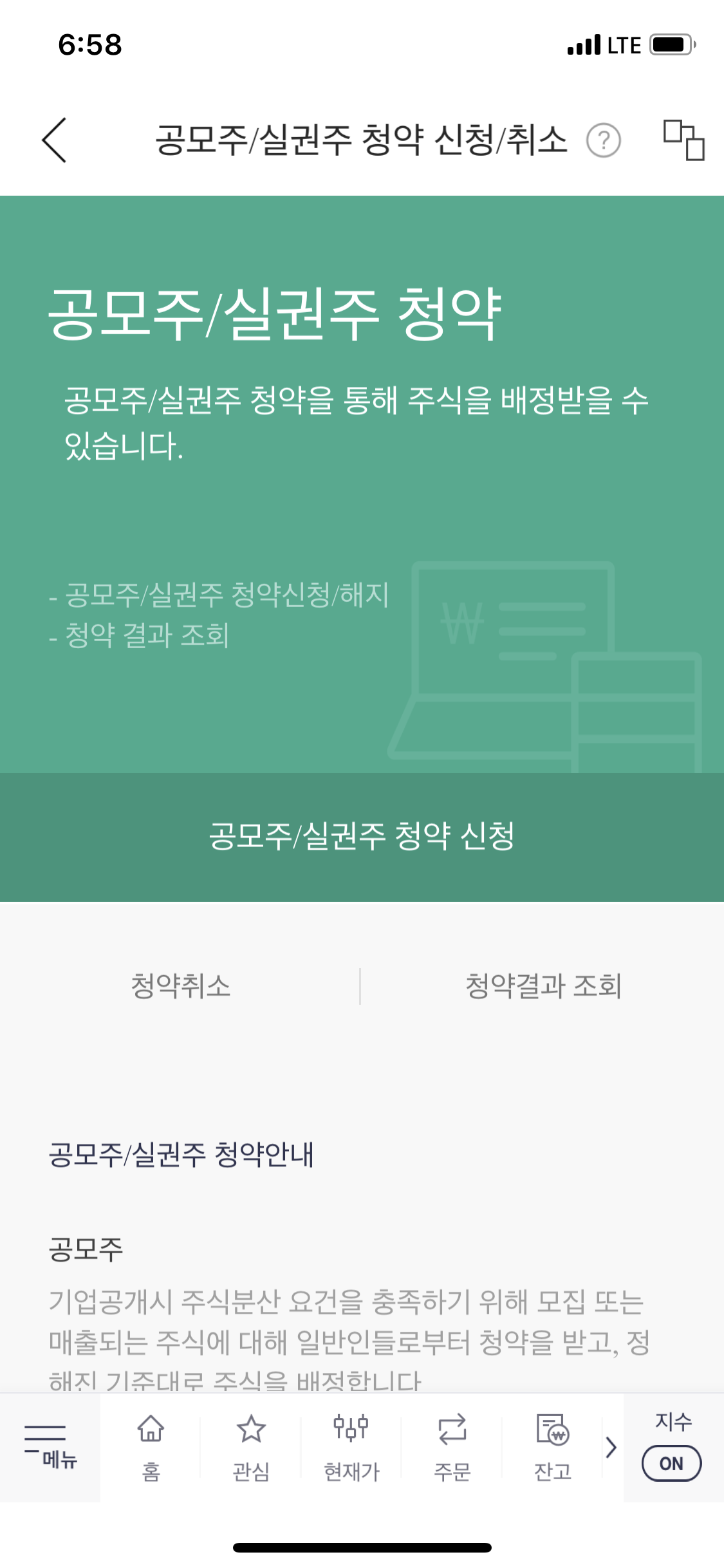 한국투자증권 애플리케이션을 실행하고 하단 좌측의 메뉴를 클릭합니다. 좌측 메뉴를 누르고 계좌/서비스>청약>공모주/실권주 청약 신청/취소를 누르면 공모주/실권주 청약신청을 할 수 있는 페이지로 이동합니다.