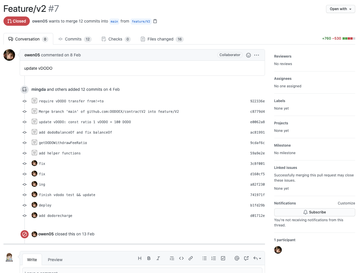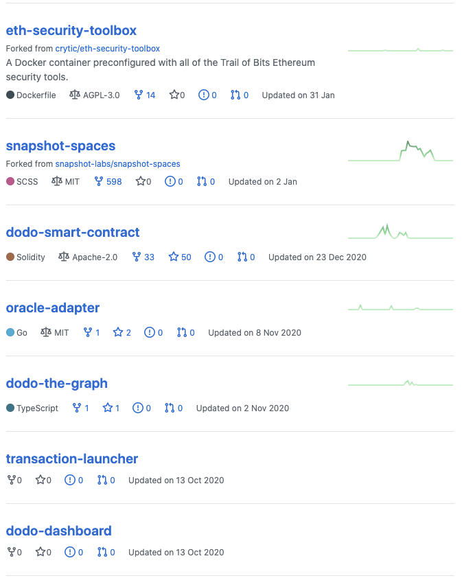 도도코인 개발팀 깃허브 프로젝트 최근 업데이트 현황을 살펴보면 딱히 업데이트가 잘되고 있어보이진 않습니다. contractV2, dodoex_v2_subgraph 저장소가 실제 최근에 개발이 진행되고 있는 프로젝트로 보입니다. hackathon-2021-spring, cn, docs와 같은 경우 실제 개발과 관련된 프로젝트라고 보기엔 어려워 최근 현황을 살펴볼 때 제외하겠습니다.