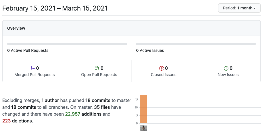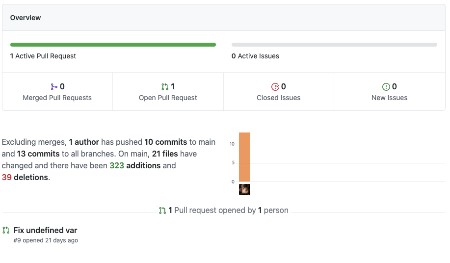 현재 프로젝트에서 열려있는 PR은 1건이고, 종료된 PR은 8건입니다. 여기서 확인할 포인트는 PR이 단순히 많다고 좋은 것이 아니라 PR이 열려있다면, 해당 PR들이 언제 열렸는지, 현재 코드리뷰가 되고 있는지를 확인하는 것입니다. PR이 열린지 꽤 되었음에도 코드리뷰가 되지 않고, 마스터 브랜치에 병합되지 않았다는 것은 프로젝트 PR 관리가 제대로 안되고 있다는 것을 확인할 수 있죠.
