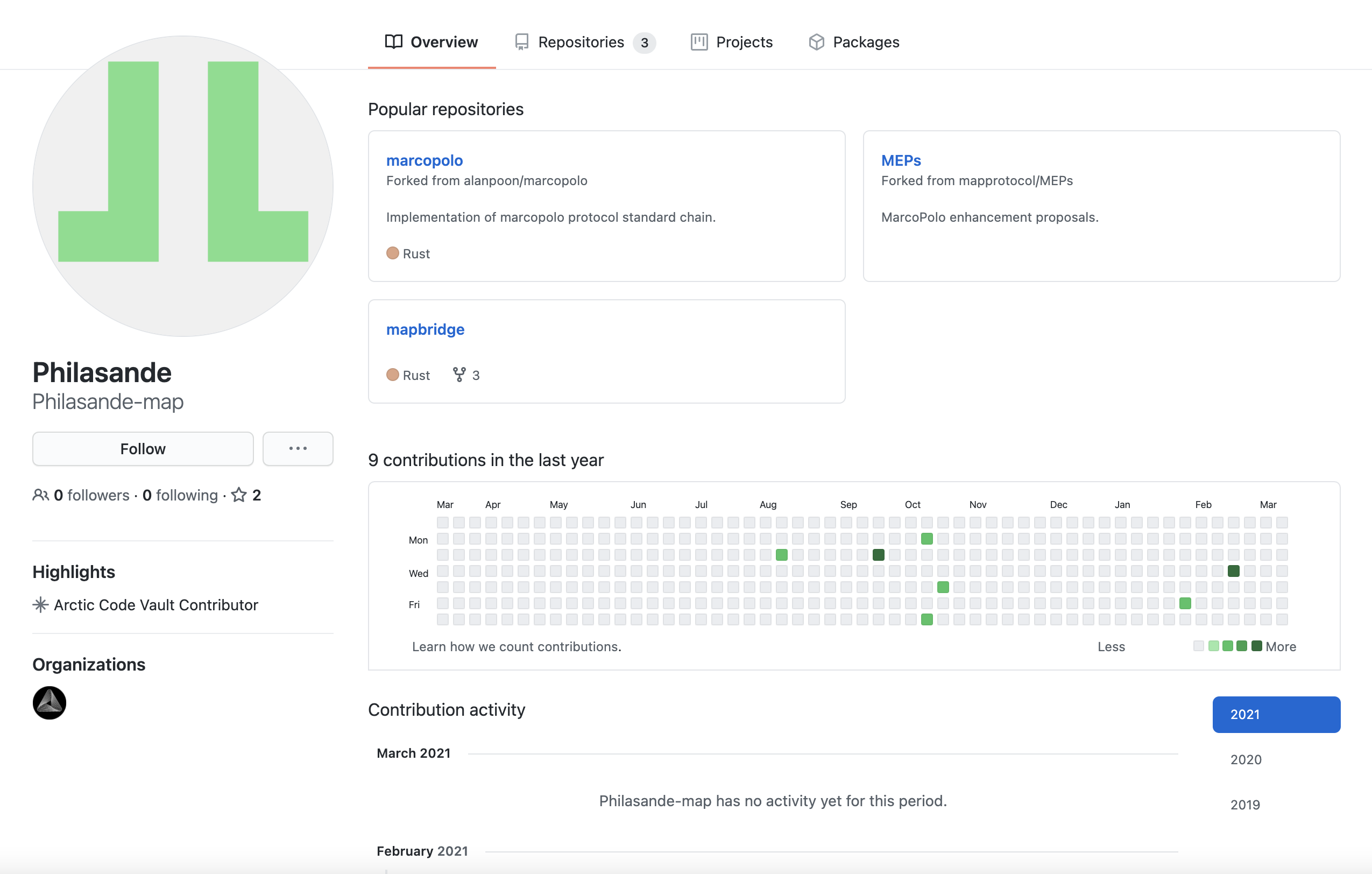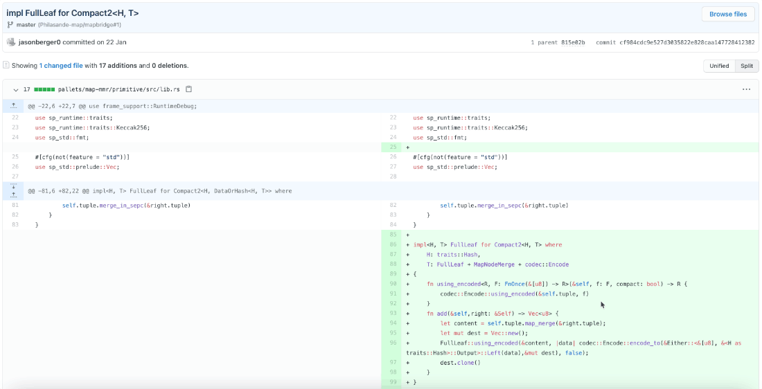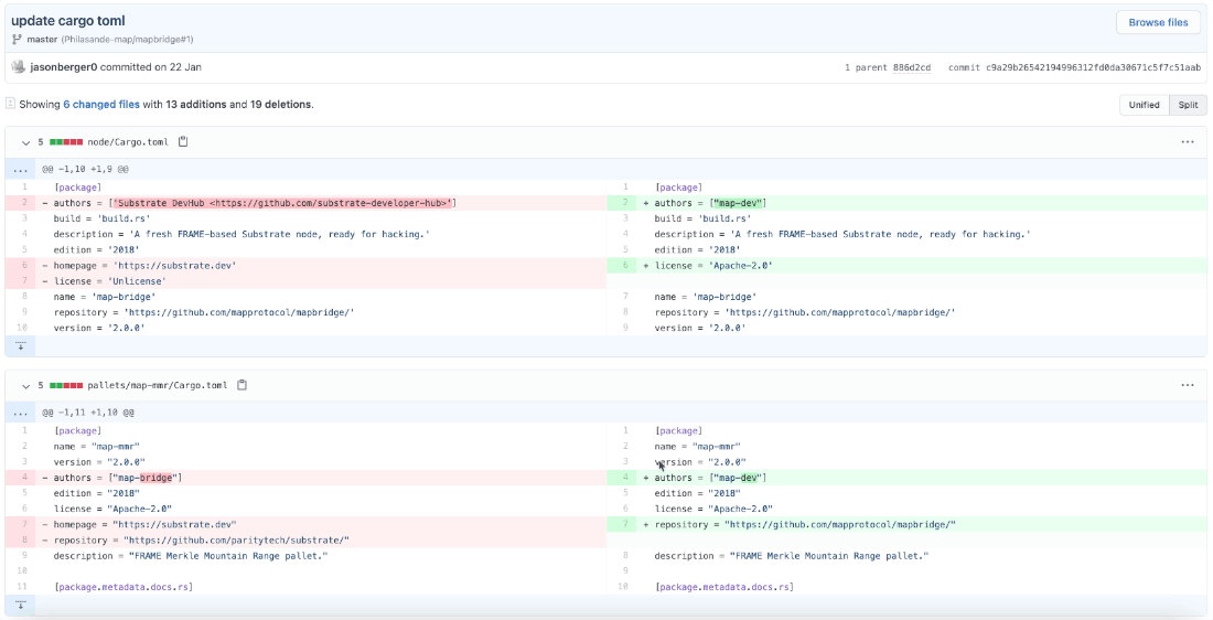 맵 프로토콜 개발팀이 실제 초기부터 개발을 진행했는지 프로젝트 초기 커밋 기록들을 살펴봅니다. 해당 프로젝트는 2020년 9월 20일에 생성되었고, Philasande-map/mapbridge에서 포크된 프로젝트지만 아마 Philasande-map 계정이 맵 프로토콜 개발팀 계정으로 보입니다.