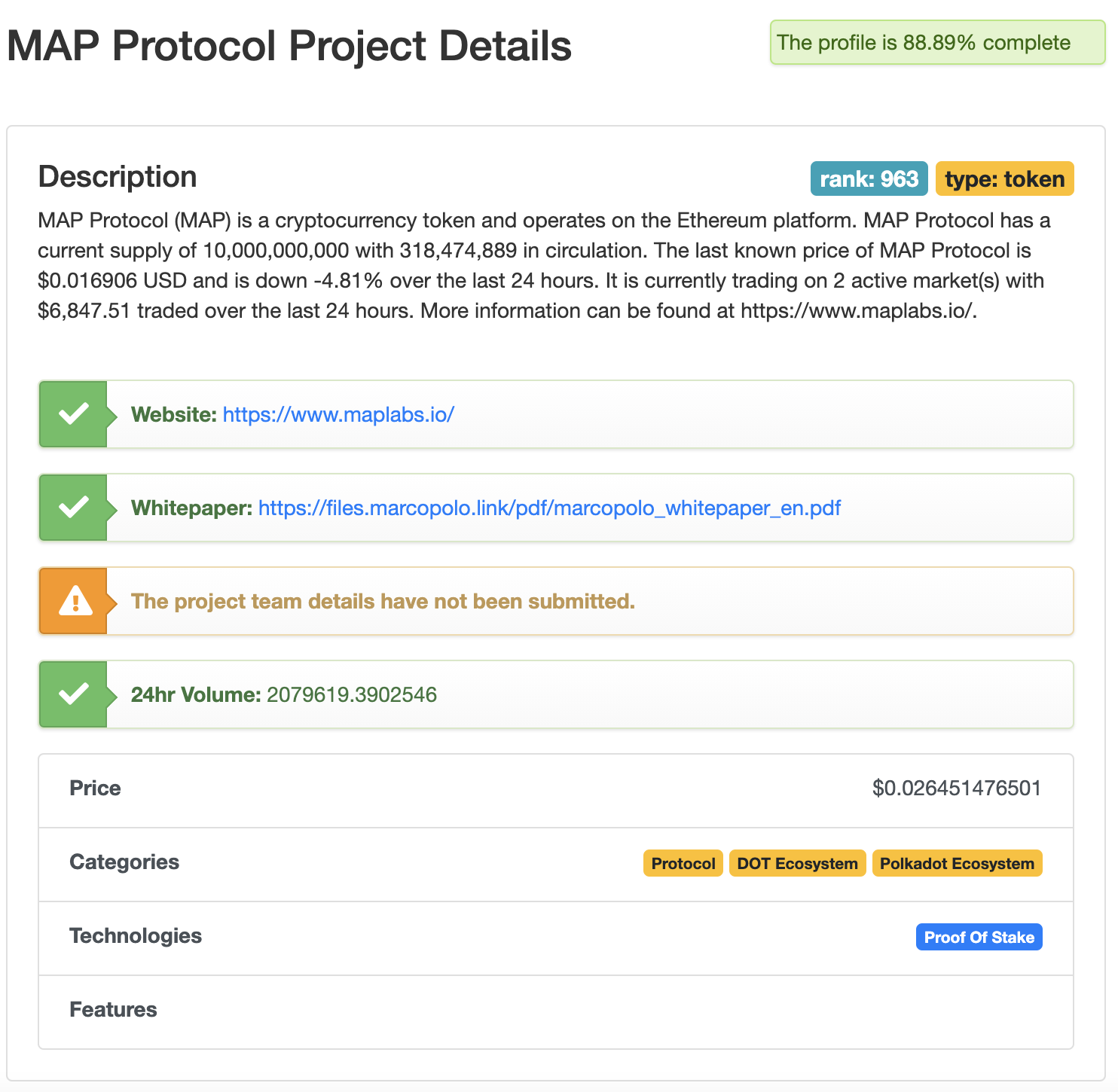 아래 스캠 판별 결과는 참고용으로만 봐주시면 좋을 것 같습니다. 기본적으로 코인 프로젝트에서 필수적으로 가져야할 요소들을 기준으로 스캠 판별을 해주는 사이트입니다. 맵 프로토콜 스캠 스코어는 3.60으로 낮은 스코어를 보여주고 있습니다.