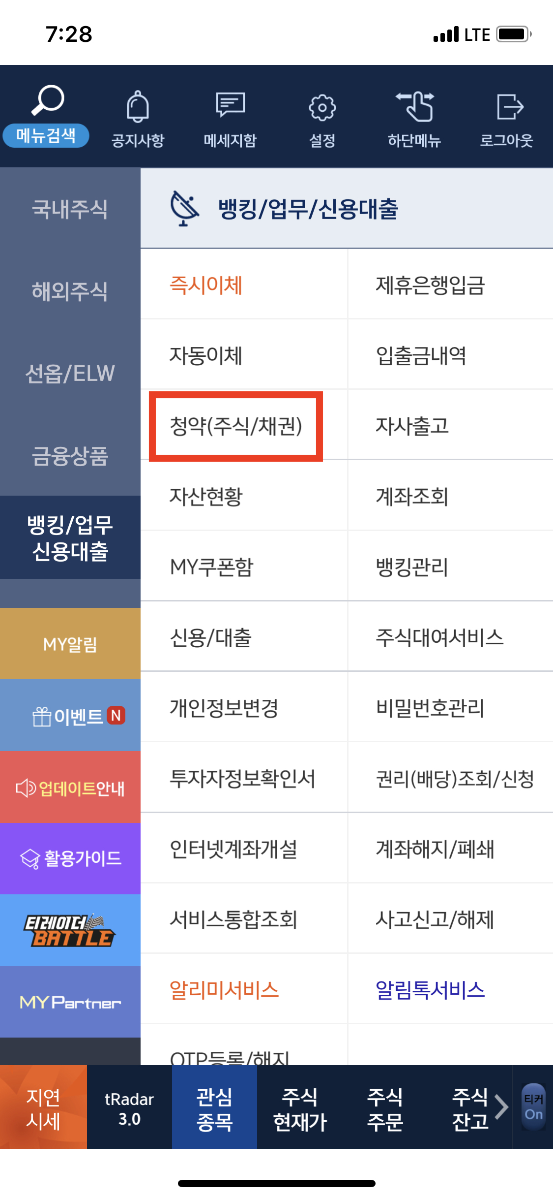 유안타증권 공모주 청약 방법은 아래와 같습니다. 유안타증권(티레이더) 실행 > 메뉴 > 뱅킹 / 업무 신용대출 > 청약(주식/채권) 메뉴 클릭해서 진행하시면 됩니다.
