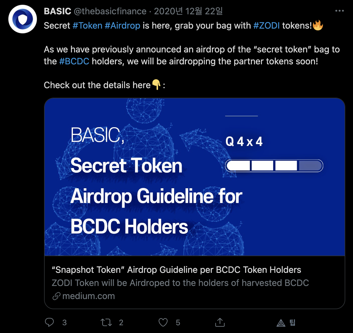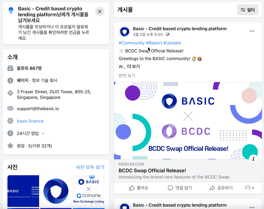 베이직 코인 페이스북 계정을 살펴보면 마케팅도 그닥 활발하게 진행하진 않는 것 같습니다. 2020년 12월 22일에 글을 쓴 후 3달 뒤인 3월에 글을 발행한 것을 볼 수 있습니다.