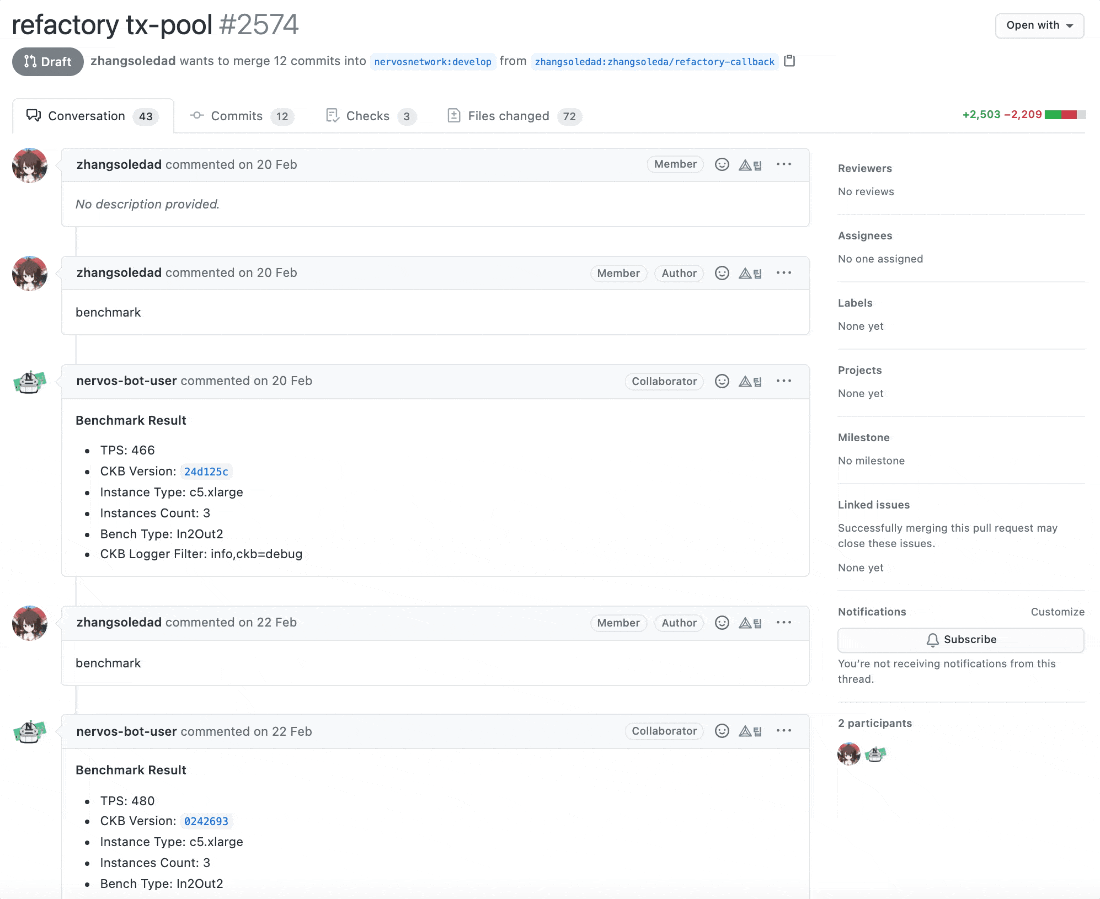 마스터 브랜치에 병합된 PR 목록들을 살펴보면 미리 개발해놓은 빌드, 벤치마크 테스트 관련 봇을 통해 테스트를 진행하는 것을 확인할 수 있습니다.