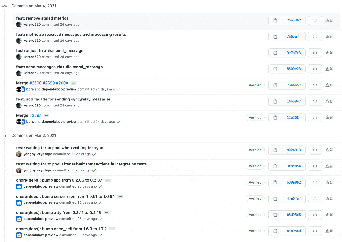 최근 업데이트된 커밋 상세 내역을 살펴보면 단순히 버전을 변경하거나 문구 수정하는 수준이 아닌 실제 개발과 관련된 수정사항들이 업데이트되는 것을 확인할 수 있습니다. 쓰레기코인(shitcoin)들의 커밋 히스토리를 살펴보면 대충 package.json 버전 변경, README 문서 문구 수정하는 수준으로 커밋을 작성하는 경우가 굉장히 많죠. 현재까지도 꽤 열심히 개발을 진행하고 있는 것으로 보입니다.