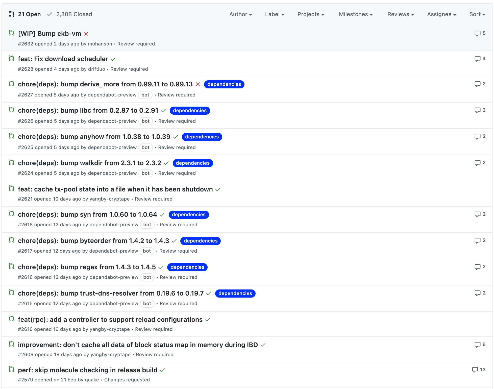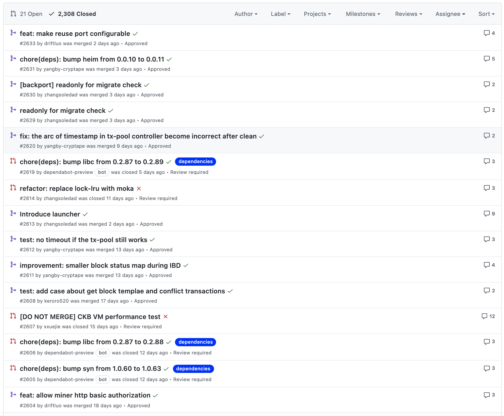 현재 프로젝트에서 열려있는 PR은 21건이고, 종료된 PR은 2,308건입니다. 여기서 확인할 포인트는 PR이 단순히 많다고 좋은 것이 아니라 PR이 열려있다면, 해당 PR들이 언제 열렸는지, 현재 코드리뷰가 되고 있는지를 확인하는 것입니다. PR이 열린지 꽤 되었음에도 코드리뷰가 되지 않고, 마스터 브랜치에 병합되지 않았다는 것은 프로젝트 PR 관리가 제대로 안되고 있다는 것을 확인할 수 있죠.