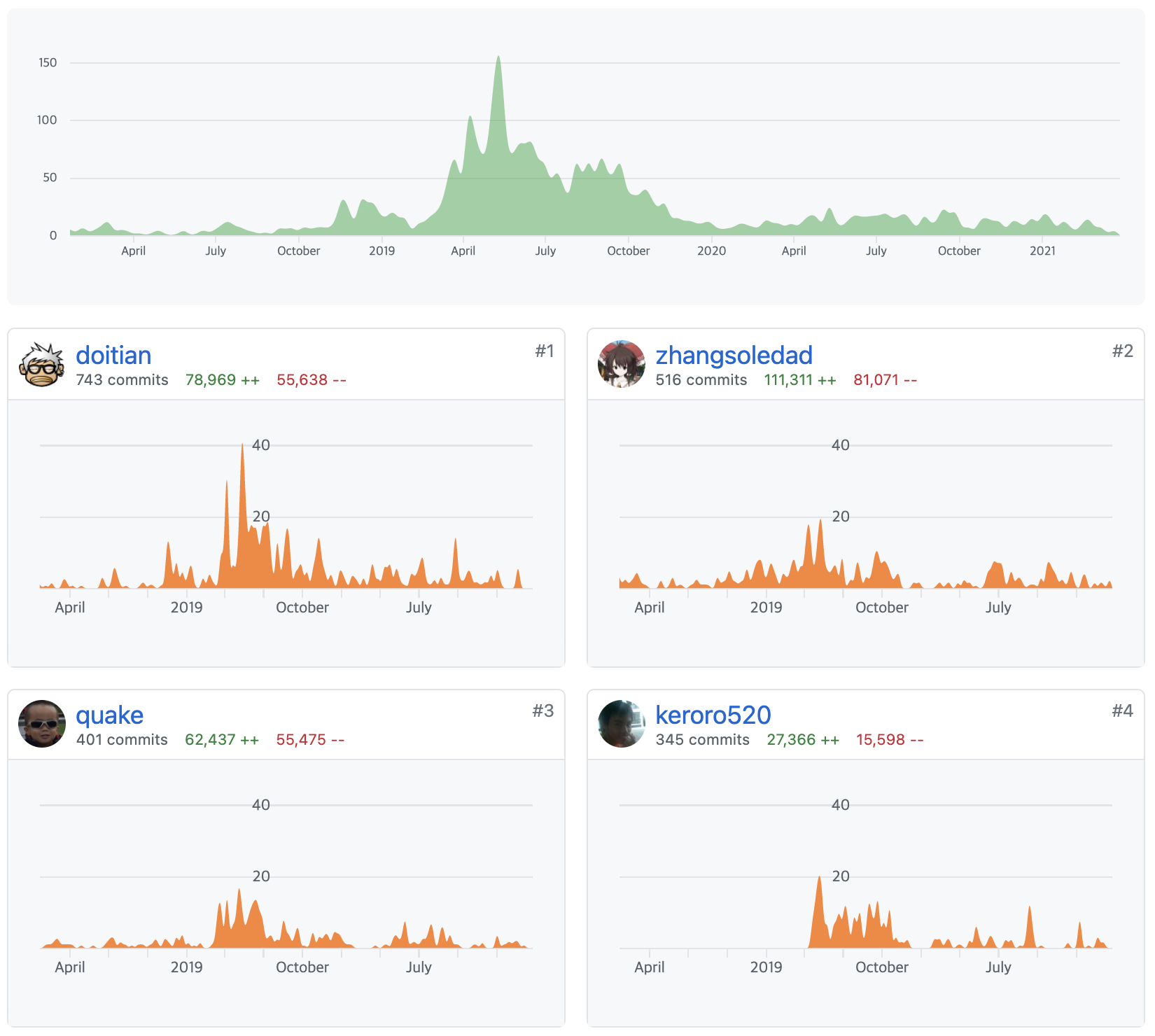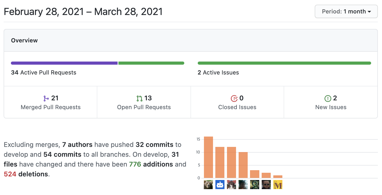 최근 한달동안 프로젝트에서 업데이트된 내용들과 전체 기간동안 프로젝트에 참여한 참여자들을 확인할 수 있습니다.