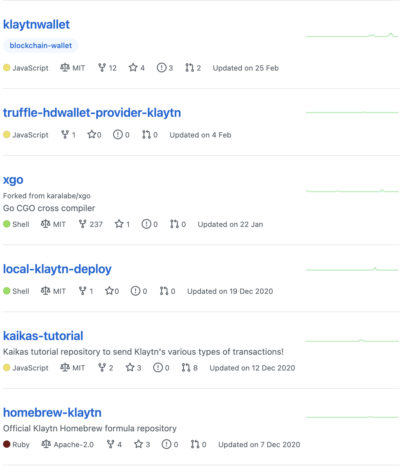 클레이튼 개발팀이 공개한 깃허브 오픈소스 프로젝트에는 현재 20개의 저장소가 생성되어 있는 것을 확인할 수 있습니다.