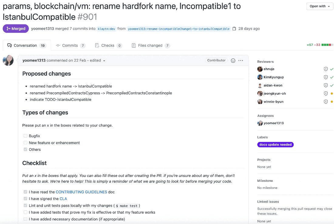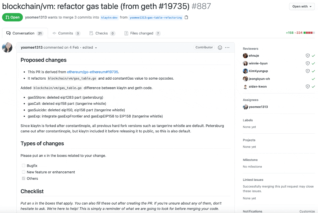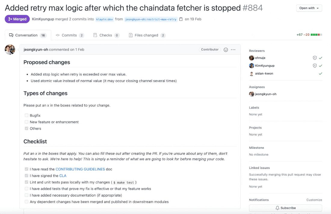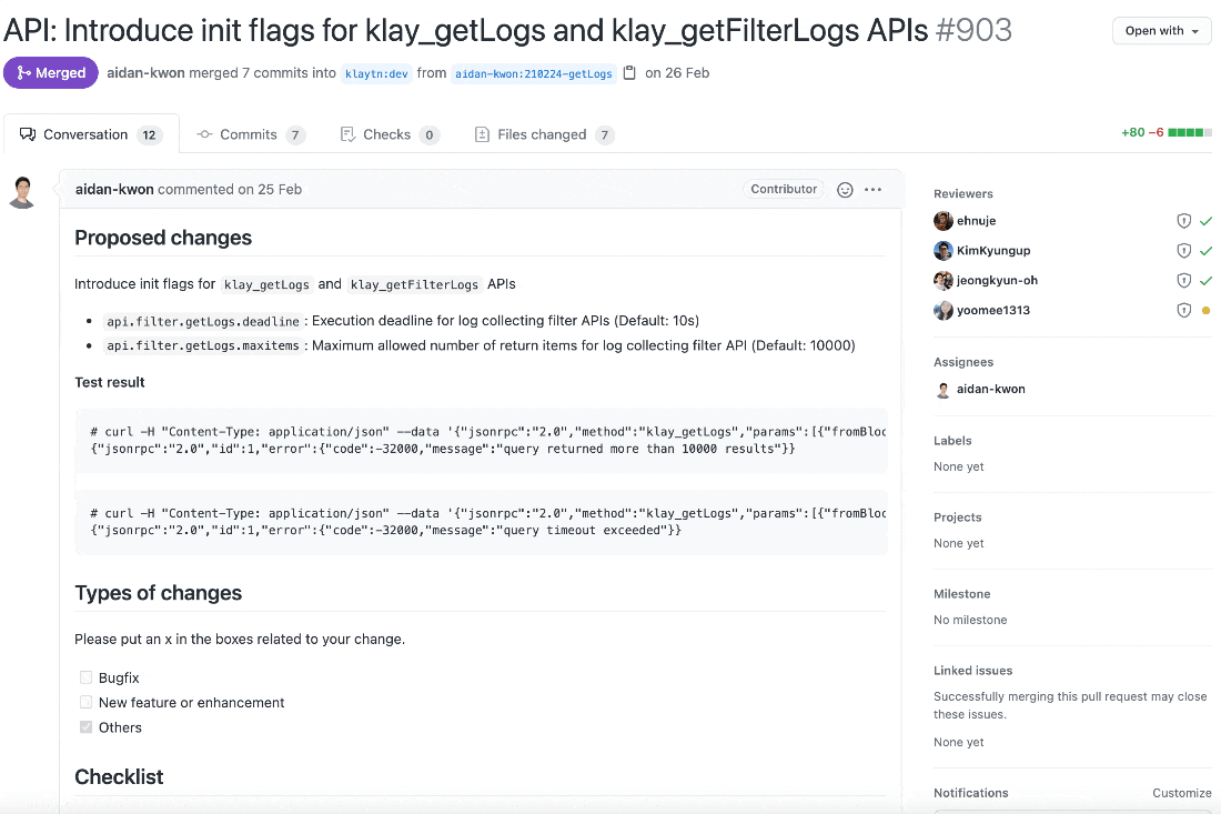 인상적인 부분은 PR을 자세히 보면 체크리스트와 라벨로 굉장히 디테일하게 관리하고 있는 것을 확인할 수 있습니다. 게다가 코드리뷰도 제대로 진행하고 있는 것으로 보이네요.