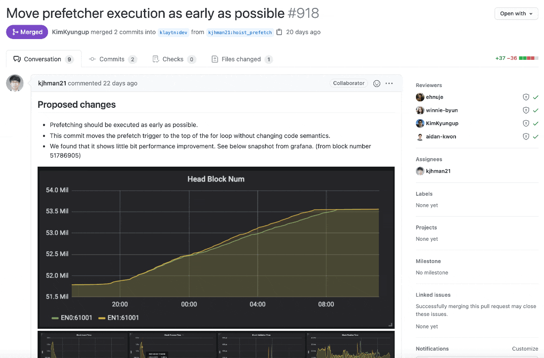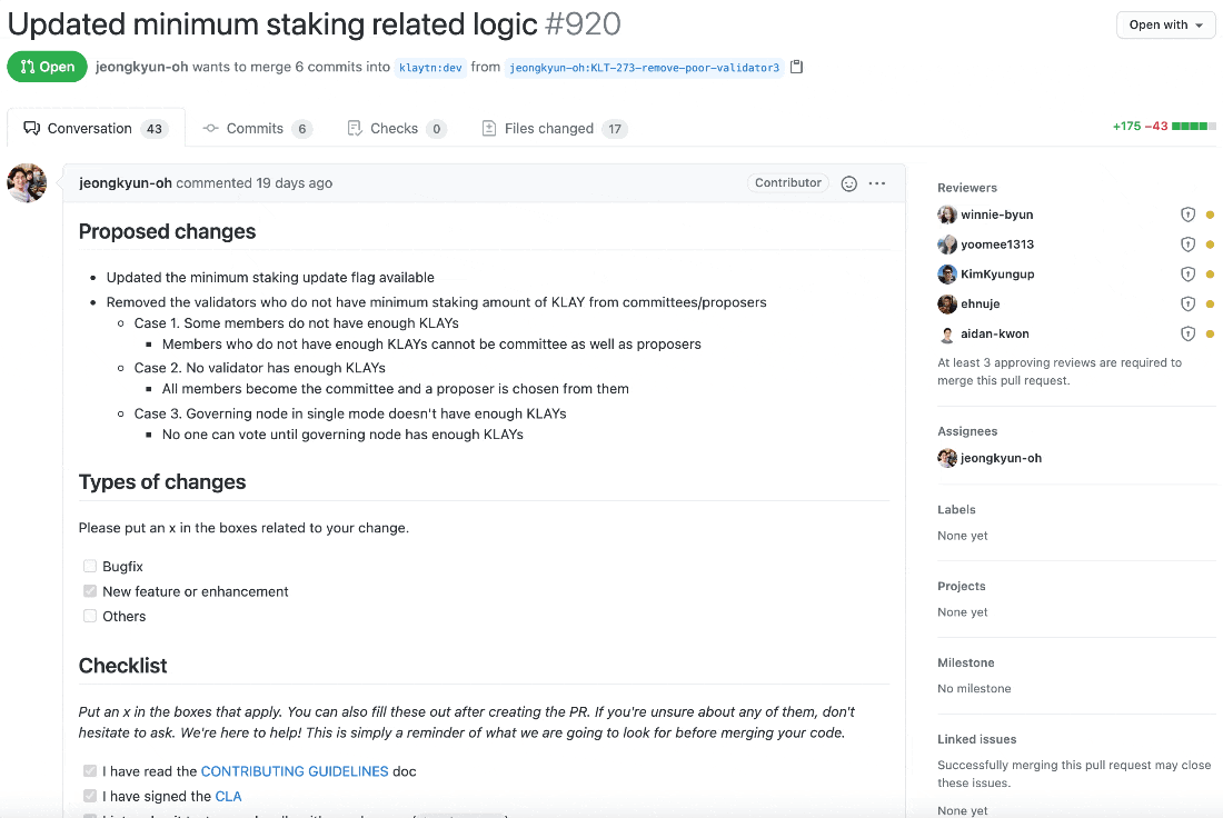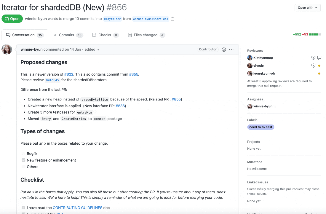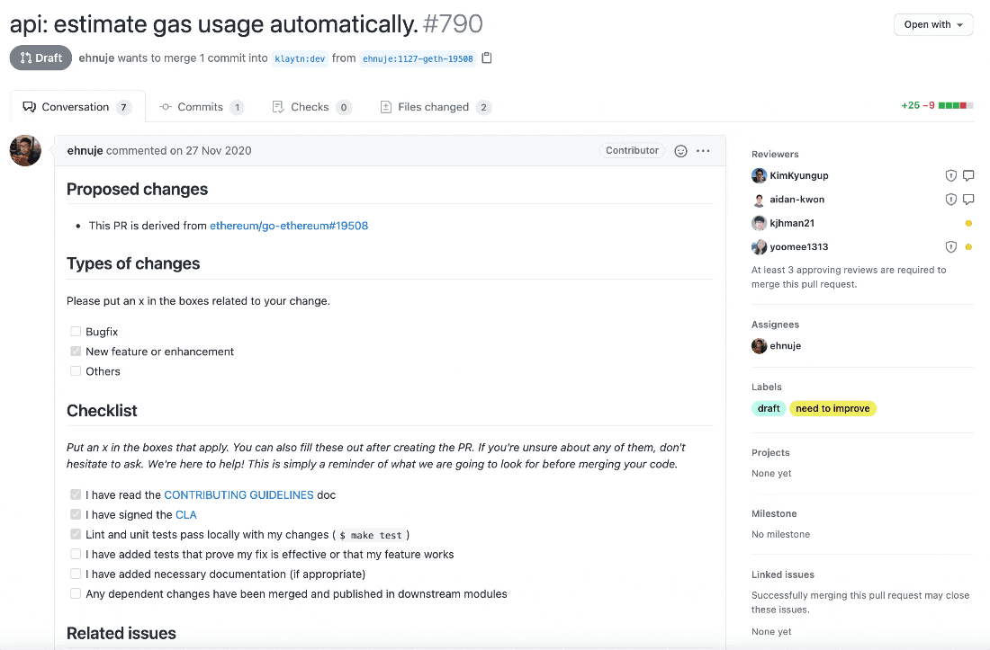 인상적인 부분은 PR을 자세히 보면 체크리스트와 라벨로 굉장히 디테일하게 관리하고 있는 것을 확인할 수 있습니다. 게다가 코드리뷰도 제대로 진행하고 있는 것으로 보이네요.