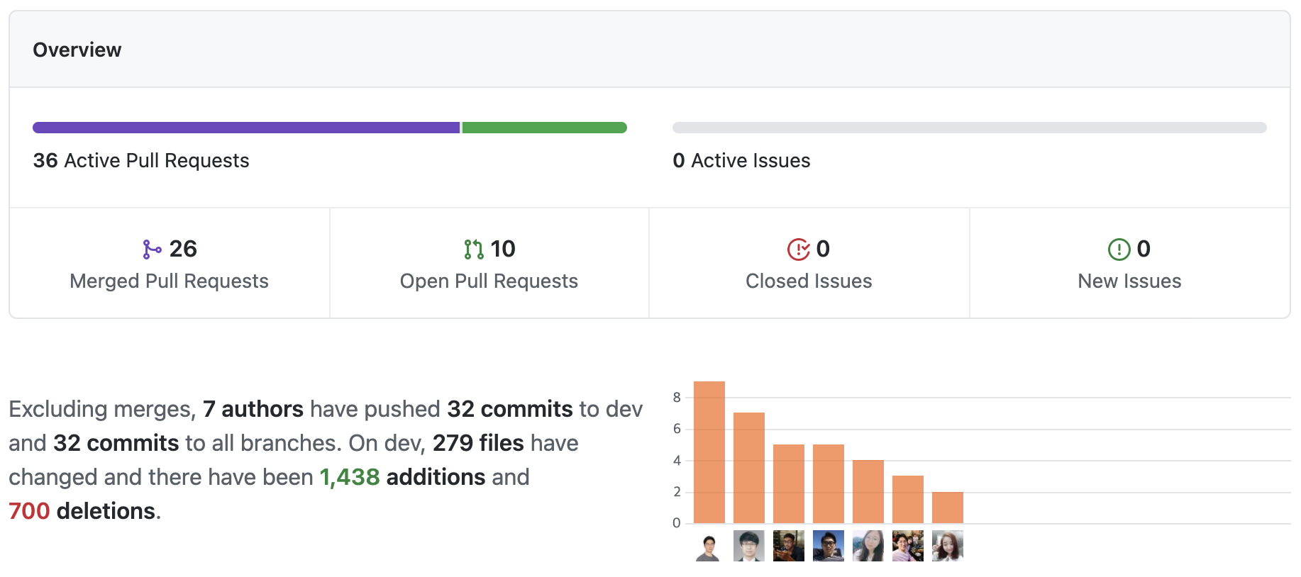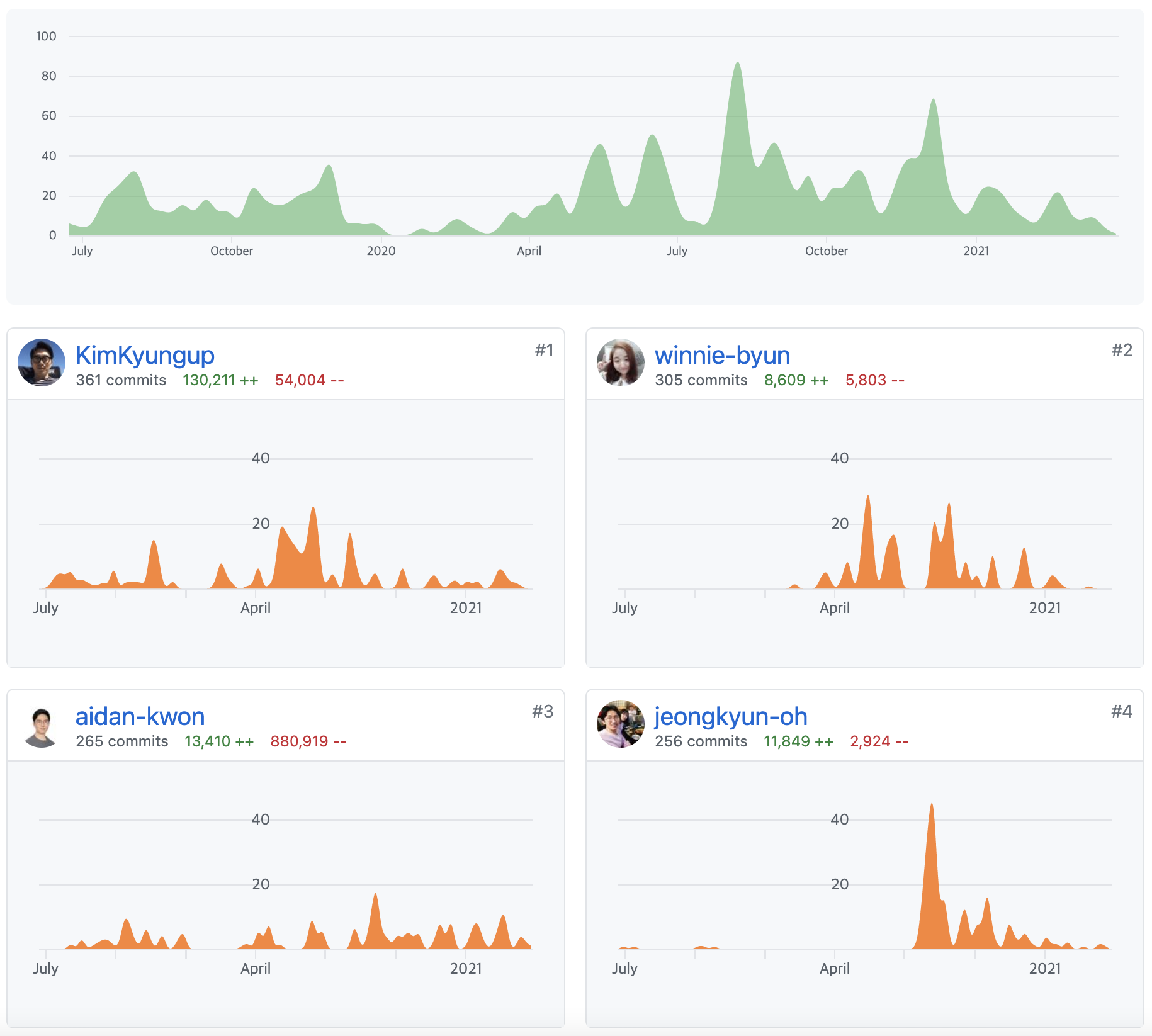 최근 한달동안 프로젝트에서 업데이트된 내용들과 전체 기간동안 프로젝트에 참여한 참여자들을 확인할 수 있습니다.