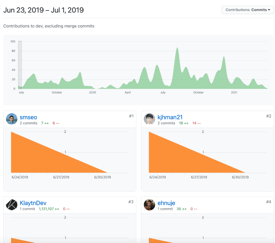 클레이튼 개발팀이 실제 초기부터 개발을 진행했는지 프로젝트 초기 커밋 기록들을 살펴봅니다. 해당 프로젝트는 2019년 6월 23일에 생성되었습니다.